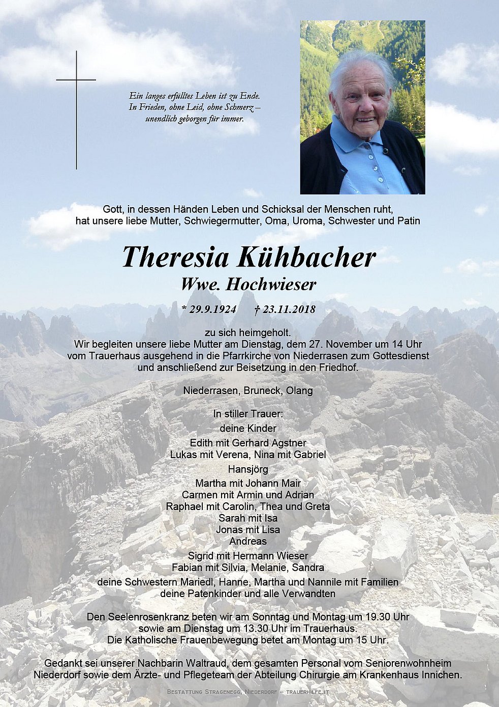 Wir begleiten unsere liebe Mutter am Dienstag, dem 27. November um 14 Uhr vom Trauerhaus ausgehend in die Pfarrkirche von Niederrasen zum Gottesdienst und anschließend zur Beisetzung in den Friedhof.