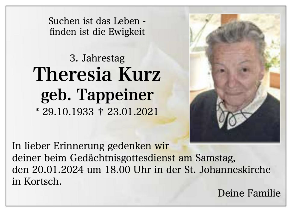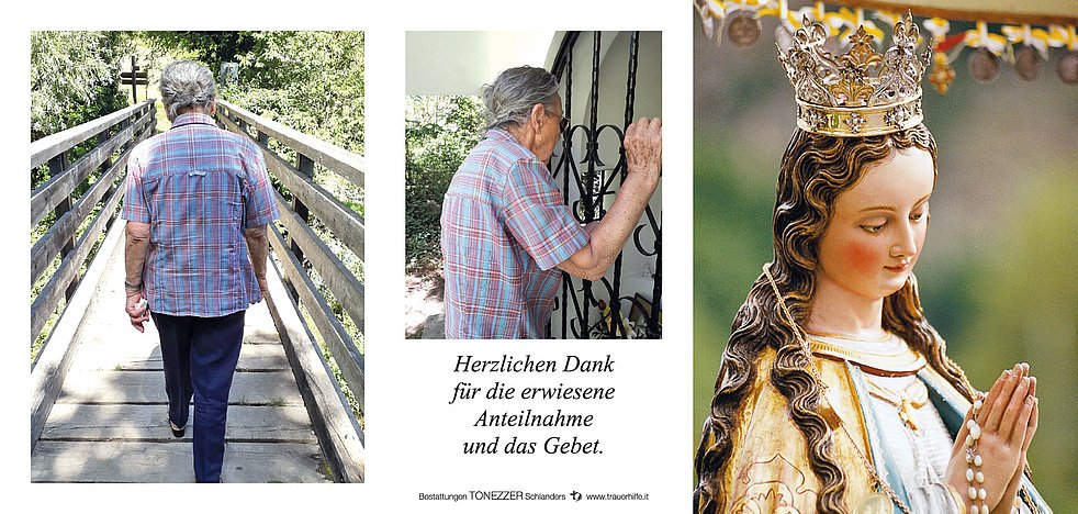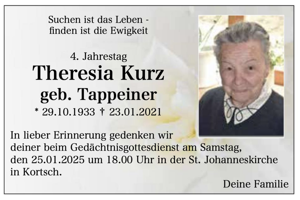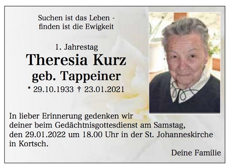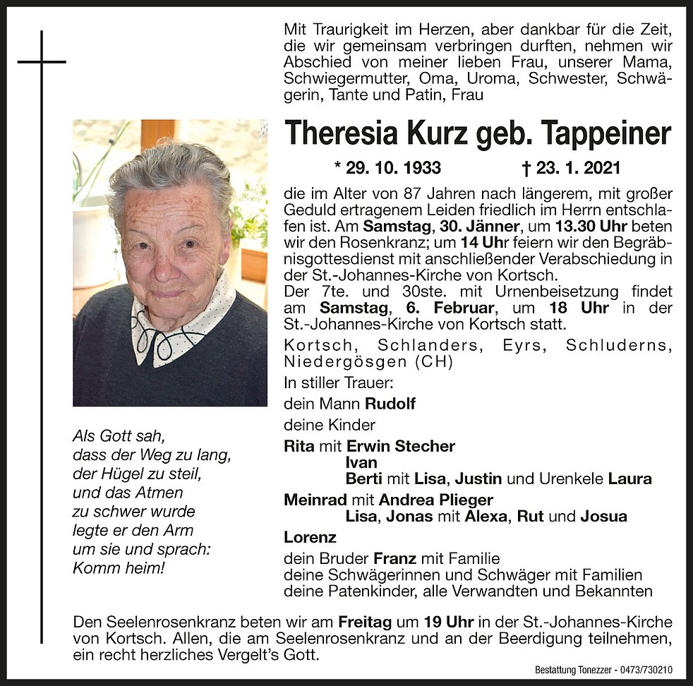 Der 7te. und 30ste. mit Urnenbeisetzung findet am Samstag, 6. Februar, um 18 Uhr in der St.-Johannes-Kirche von Kortsch statt.