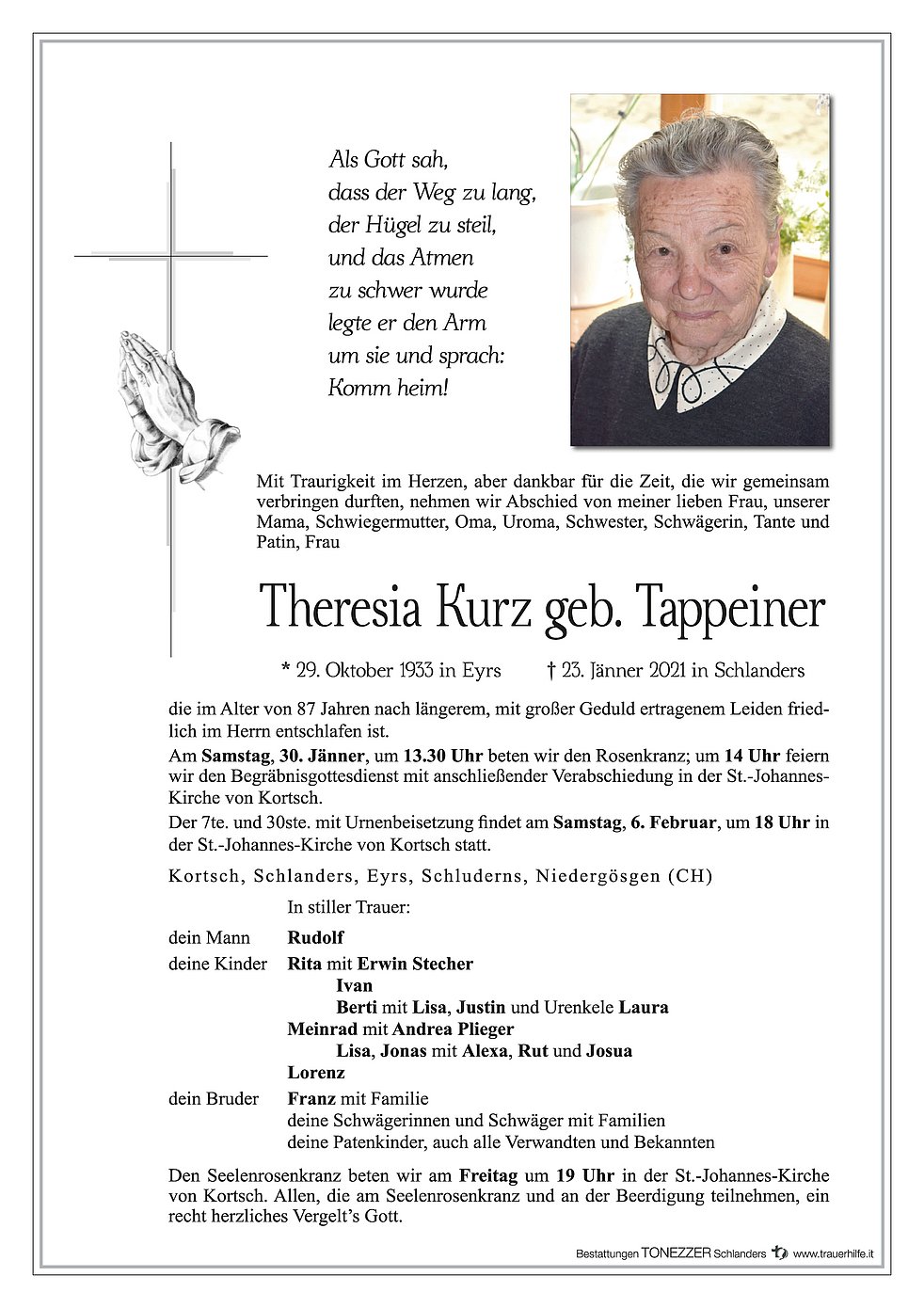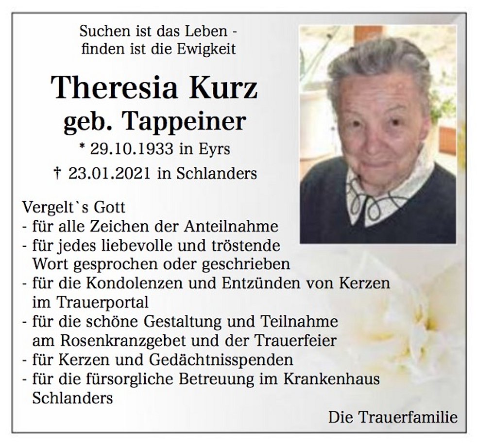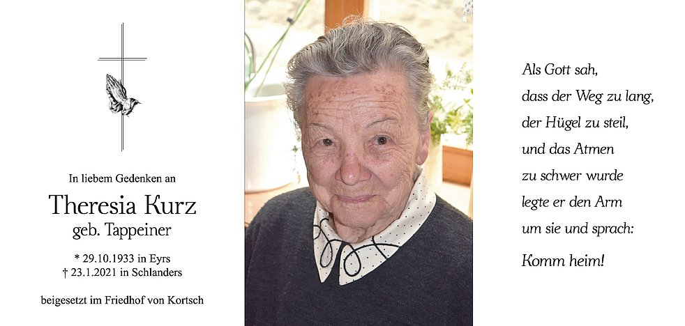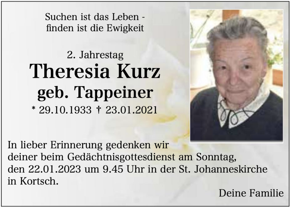 Der 7te. und 30ste. mit Urnenbeisetzung findet am Samstag, 6. Februar, um 18 Uhr in der St.-Johannes-Kirche von Kortsch statt.