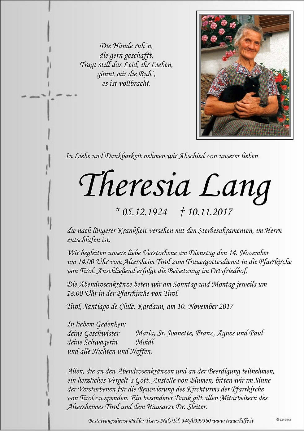 von Tirol. Anschließend erfolgt die Beisetzung im Ortsfriedhof.