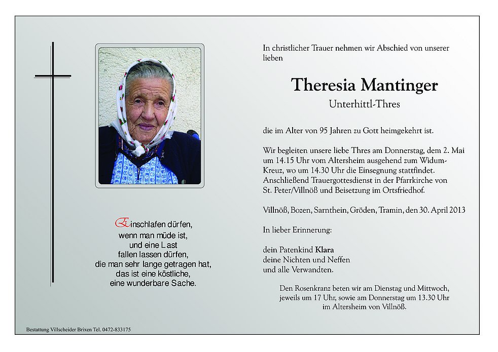 um 14.15 Uhr vom Altersheim ausgehend zum Widum-Kreuz, wo um 14.30 Uhr die Einsegnung stattfindet. Anschließend Trauergottesdienst in der Pfarrkirche von