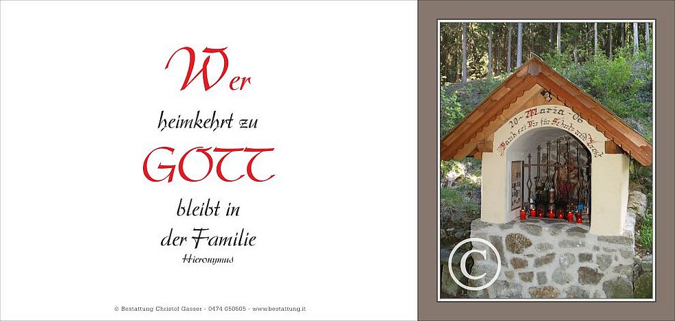 Gemeinsam begleiten wir unsere liebe Mamme am Mittwoch, dem 9. Mai, um 13.30 Uhr vom Trauerhaus ausgehend, zum Gottesdienst um 14.30 Uhr in die Pfarrkirche von Terenten. Anschließend übergeben wir sie der geweihten Erde.