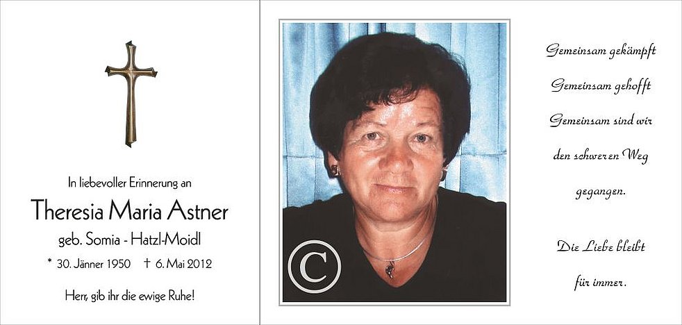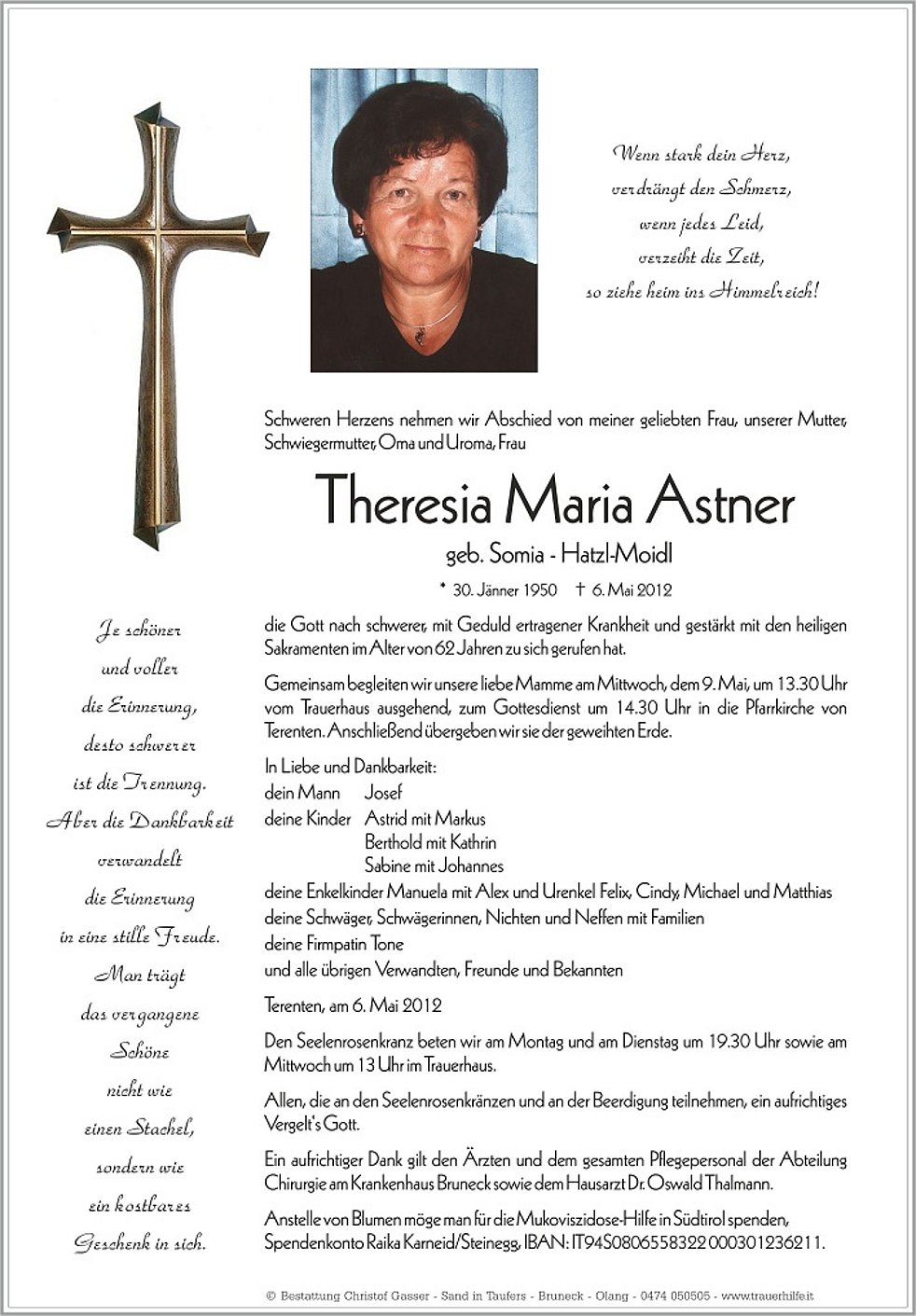 Anstelle von Blumen möge man für die Mukoviszidose-Hilfe in Südtirol spenden,Spendenkonto Raika Karneid/Steinegg, IBAN: IT94S0806558322 000301236211.