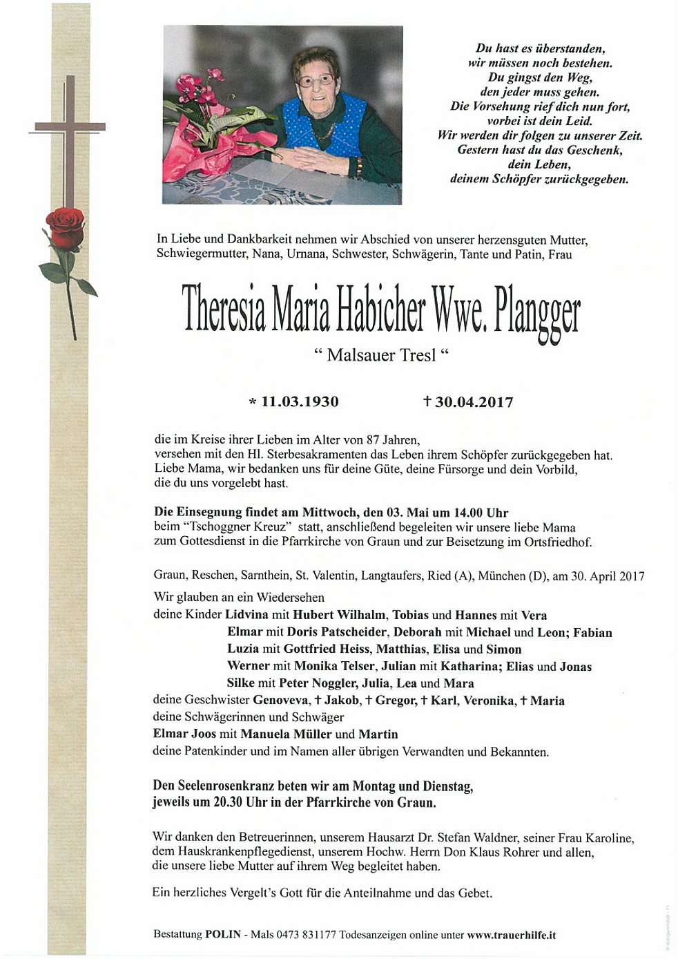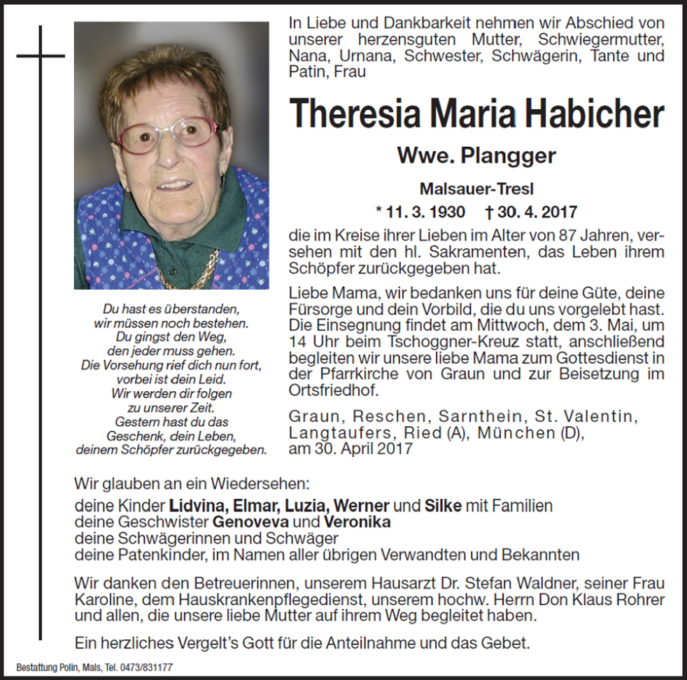 zum Gottesdienst in die Pfarrkirche von Graun und zur Beisetzung im Ortsfriedhof.