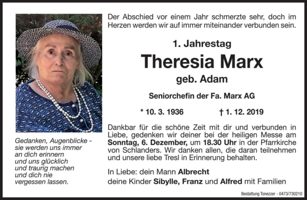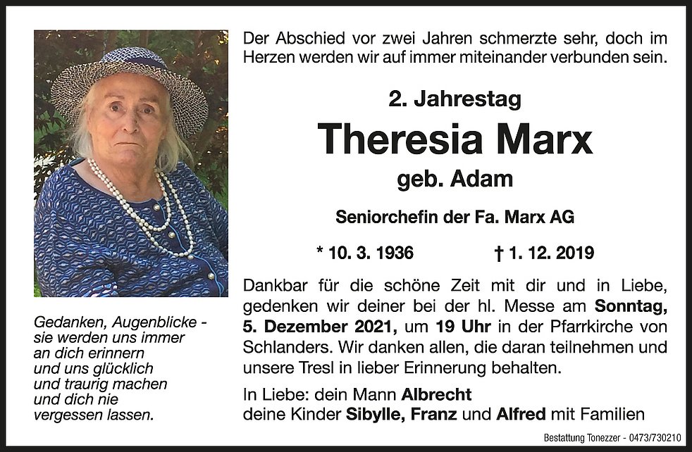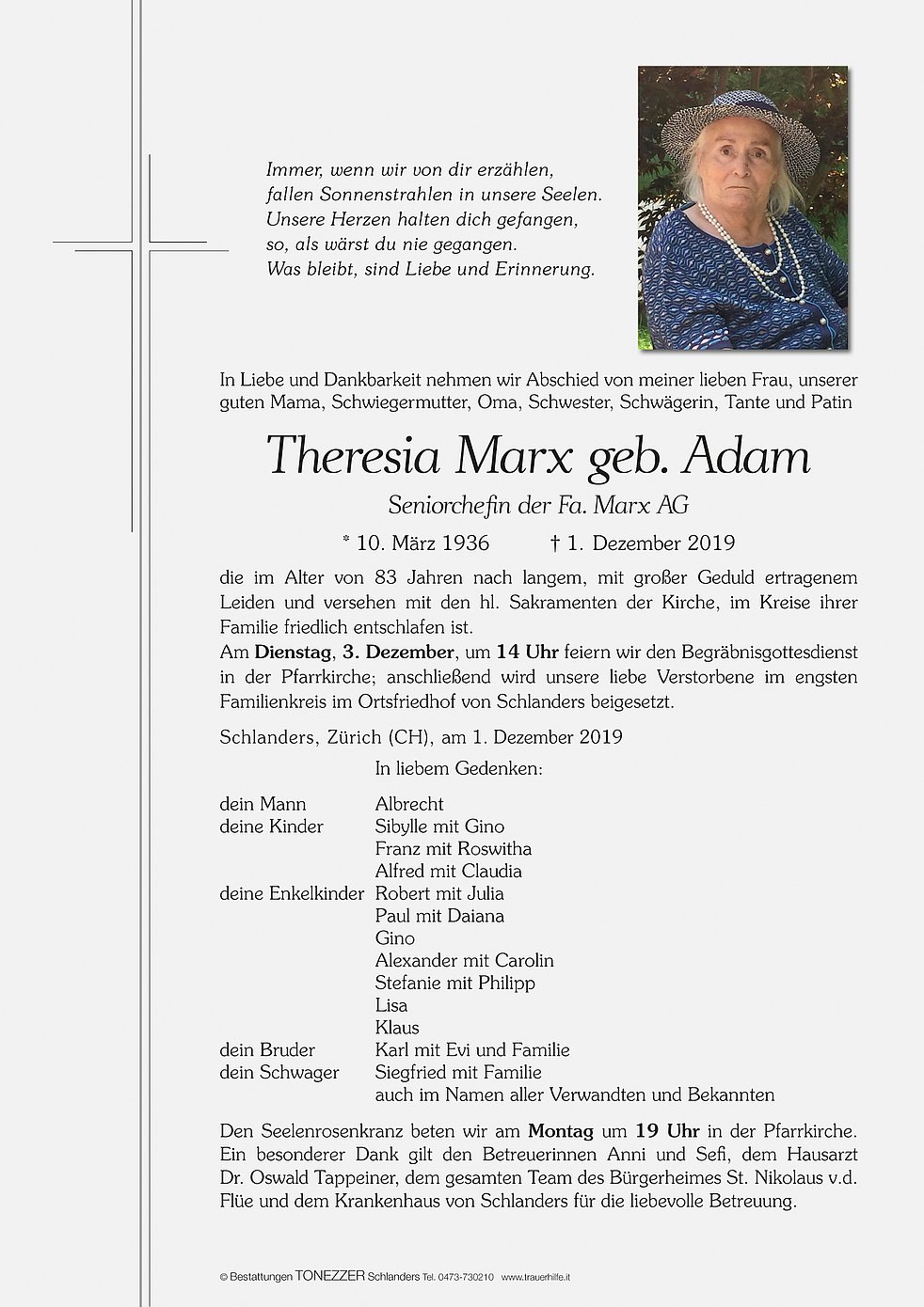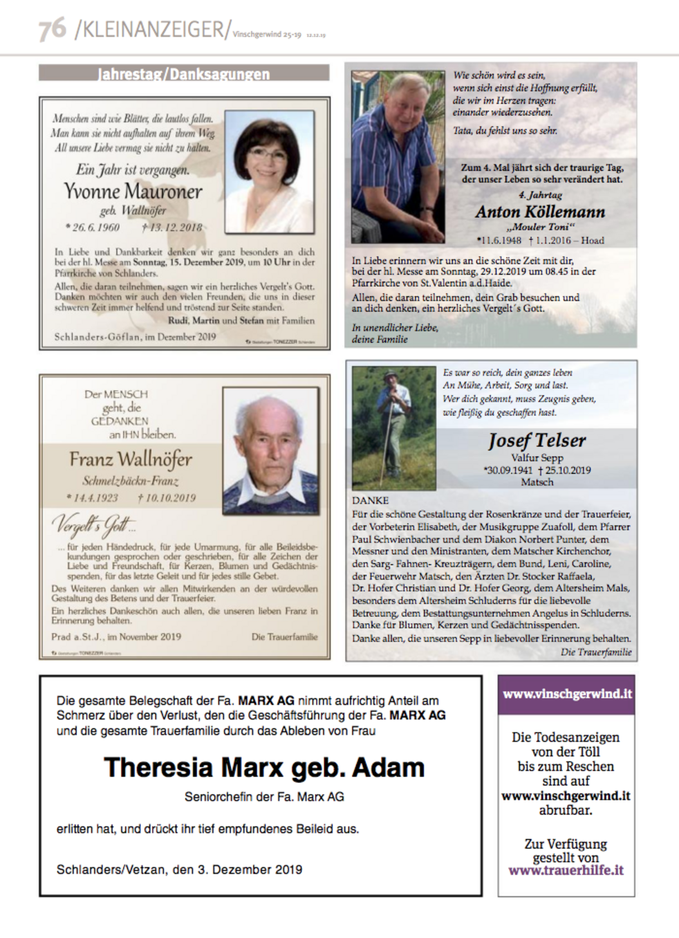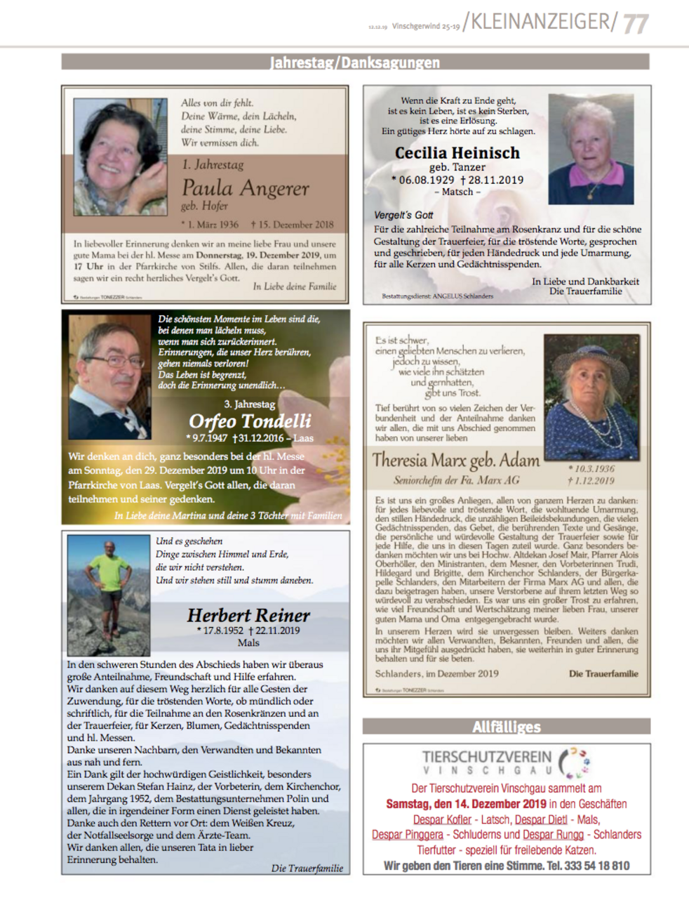 Am Dienstag, 3. Dezember, um 14 Uhr feiern wir den Begräbnisgottesdienst in der Pfarrkirche; anschließend wird unsere liebe Verstorbene im engsten Familienkreis im Ortsfriedhof von Schlanders beigesetzt.