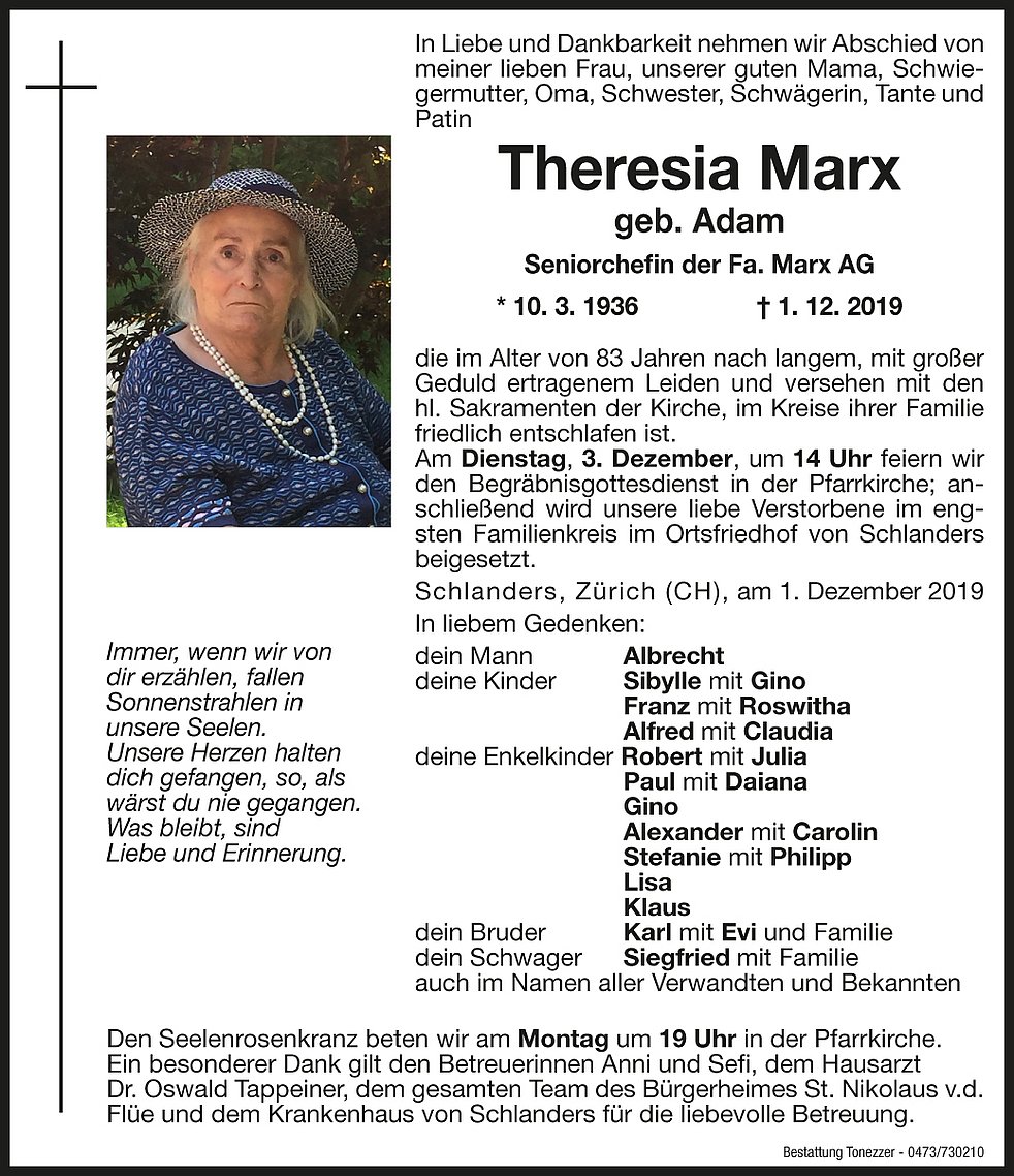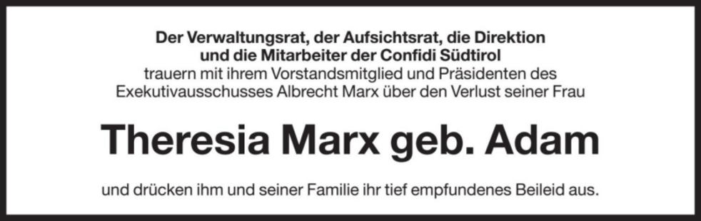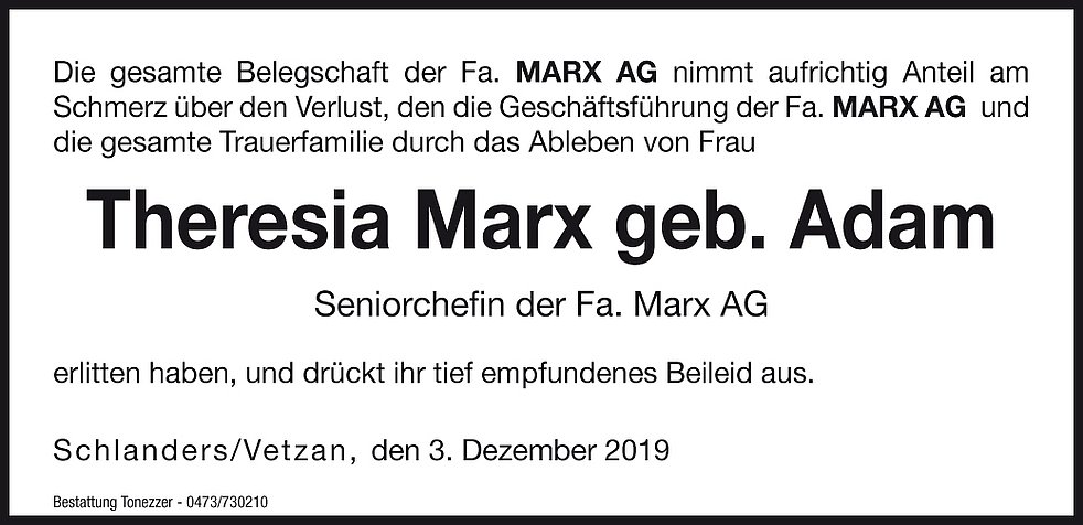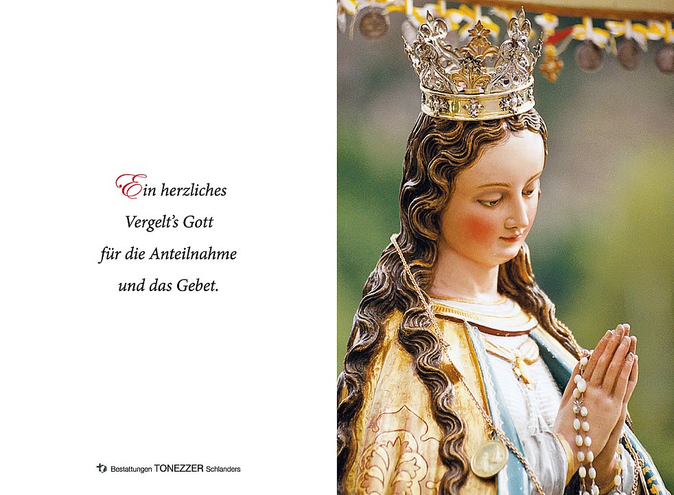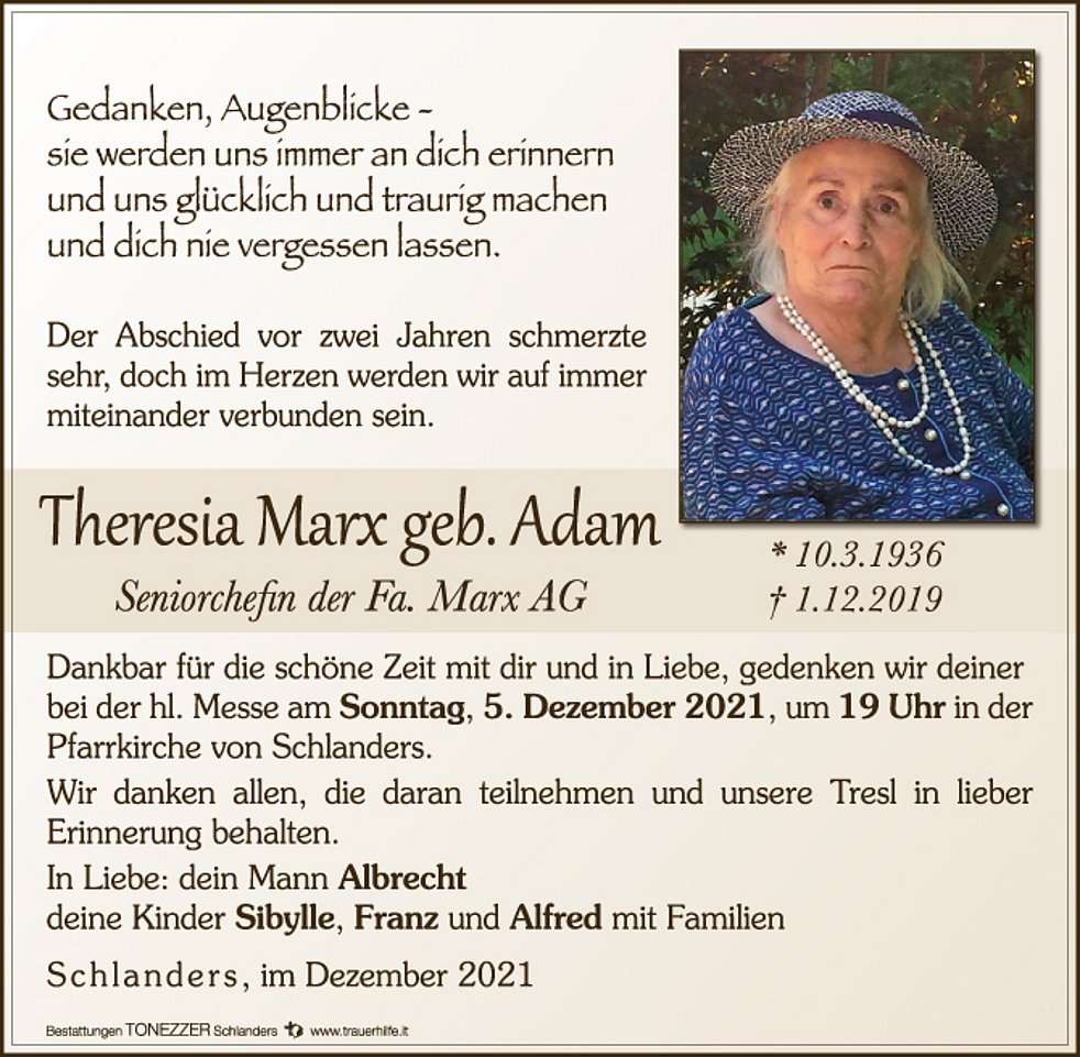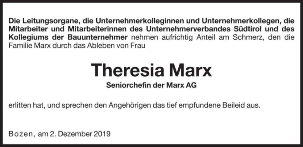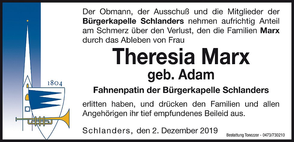 Am Dienstag, 3. Dezember, um 14 Uhr feiern wir den Begräbnisgottesdienst in der Pfarrkirche; anschließend wird unsere liebe Verstorbene im engsten Familienkreis im Ortsfriedhof von Schlanders beigesetzt.