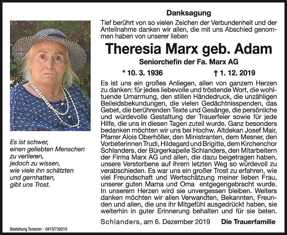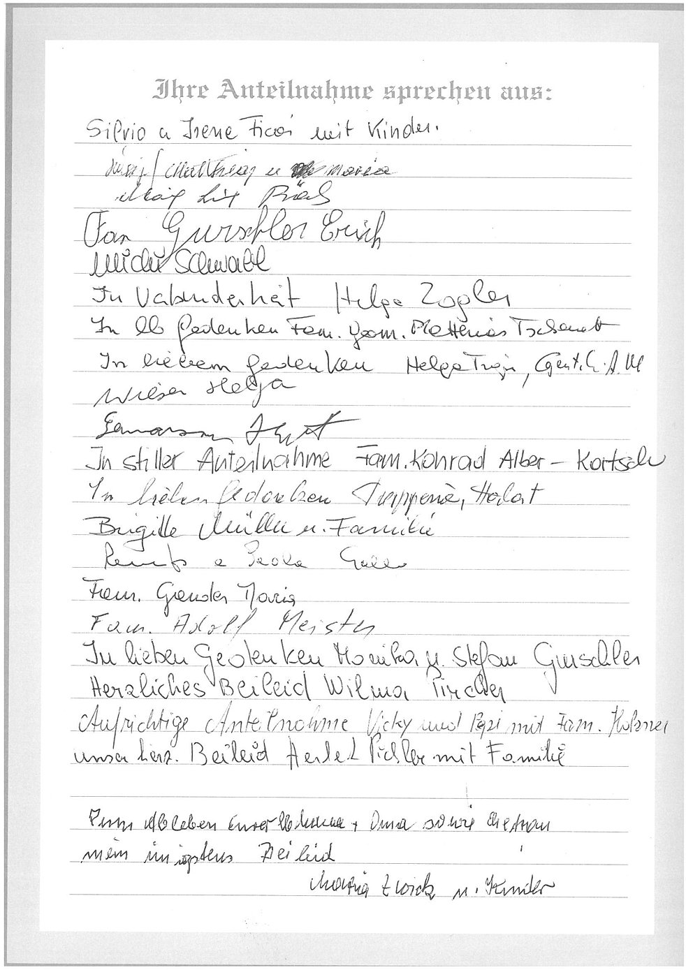 Ein besonderer Dank gilt den Betreuerinnen Anni und Sefi, dem Hausarzt Dr. Oswald Tappeiner, dem gesamten Team des Bürgerheimes St. Nikolaus v.d. Flüe und dem Krankenhaus von Schlanders für die liebevolle Betreuung.