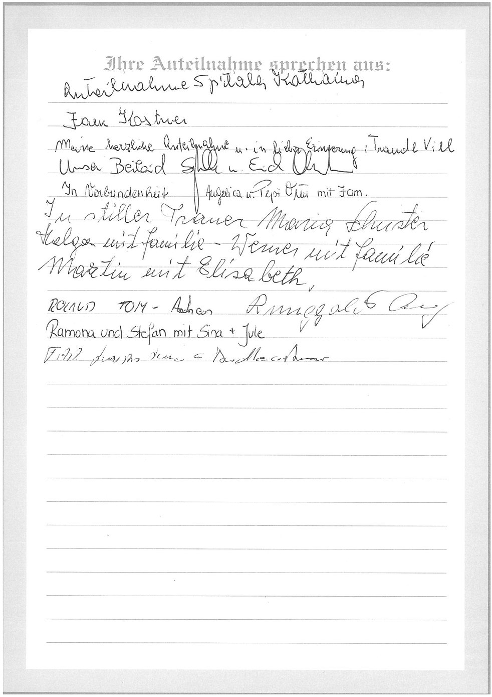 die im Alter von 83 Jahren nach langem, mit großer Geduld ertragenem Leiden und versehen mit den hl. Sakramenten der Kirche, im Kreise ihrer Familie friedlich entschlafen ist.