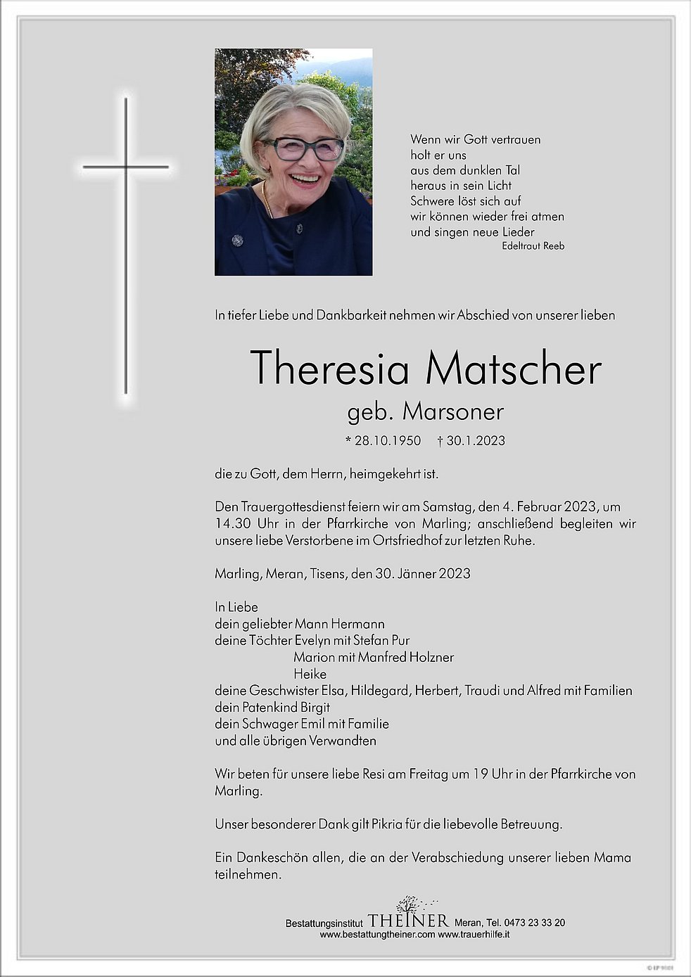 Den Trauergottesdienst feiern wir am Samstag, den 4. Februar 2023, um 14.30 Uhr in der Pfarrkirche von Marling; anschließend begleiten wir unsere liebe Verstorbene im Ortsfriedhof zur letzten Ruhe.