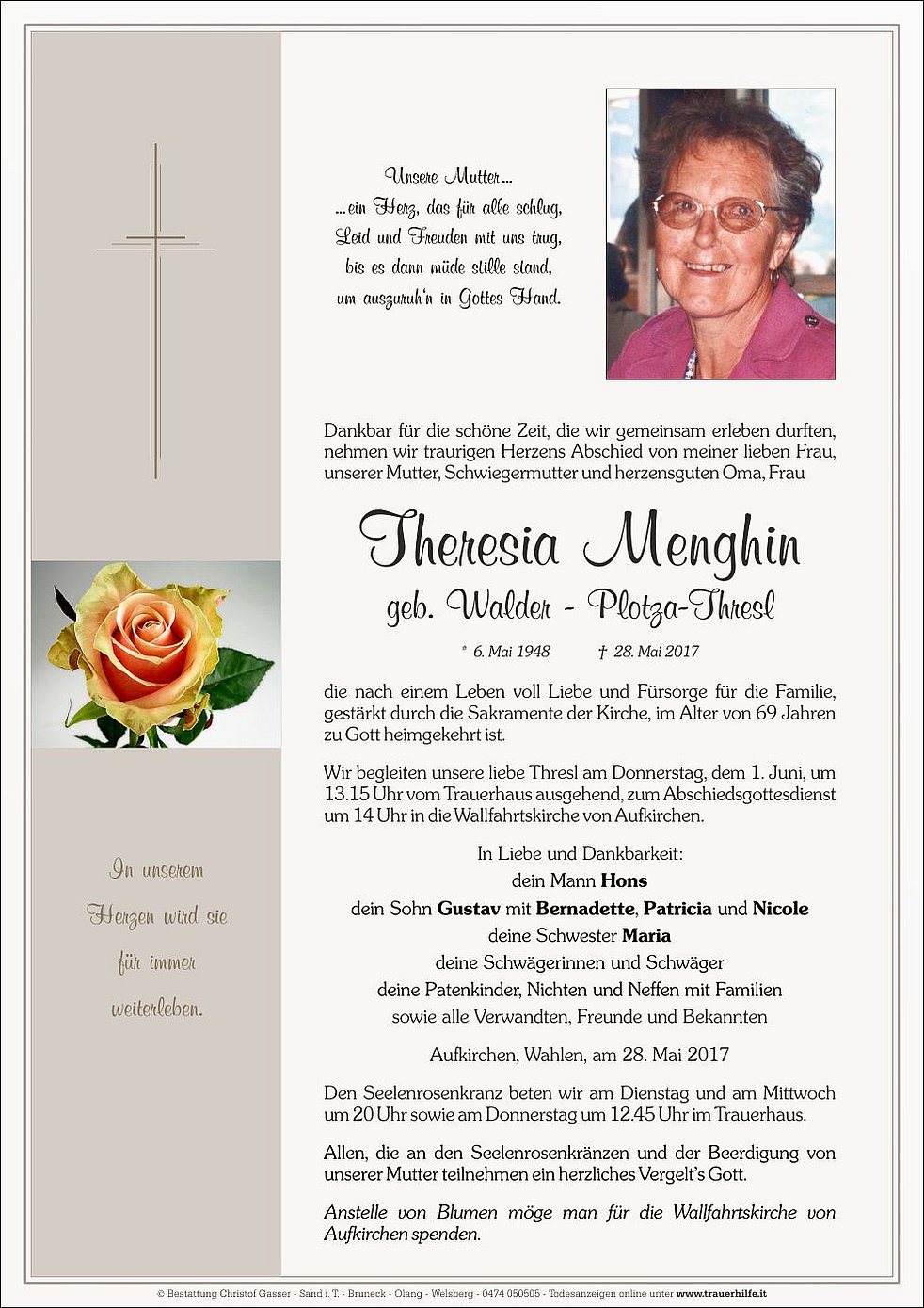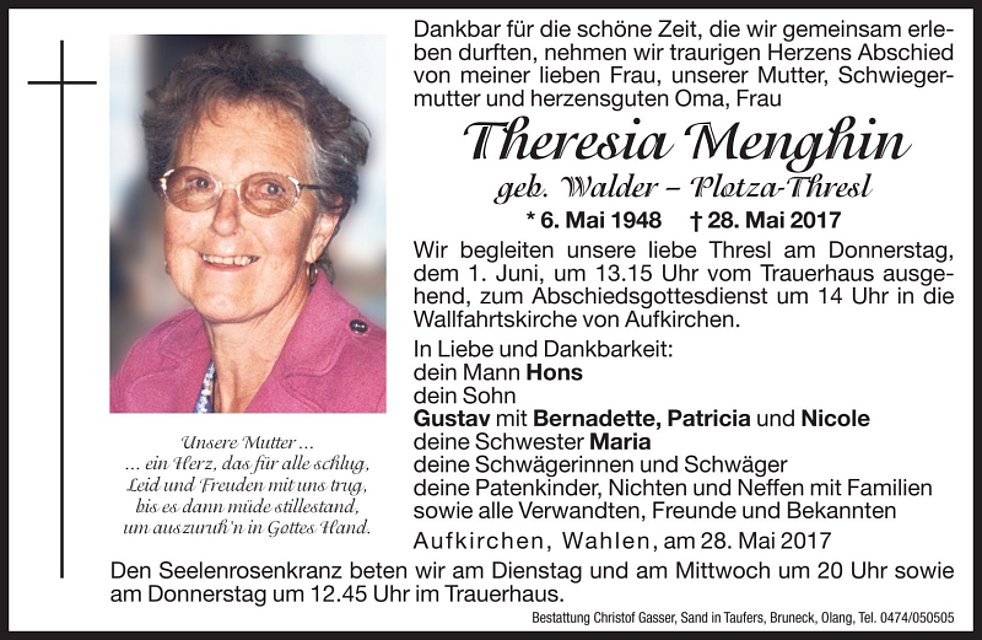 Wir begleiten unsere liebe Thresl am Donnerstag, dem 1. Juni, um 13.15 Uhr vom Trauerhaus ausgehend, zum Abschiedsgottesdienst um 14 Uhr in die Wallfahrtskirche von Aufkirchen.