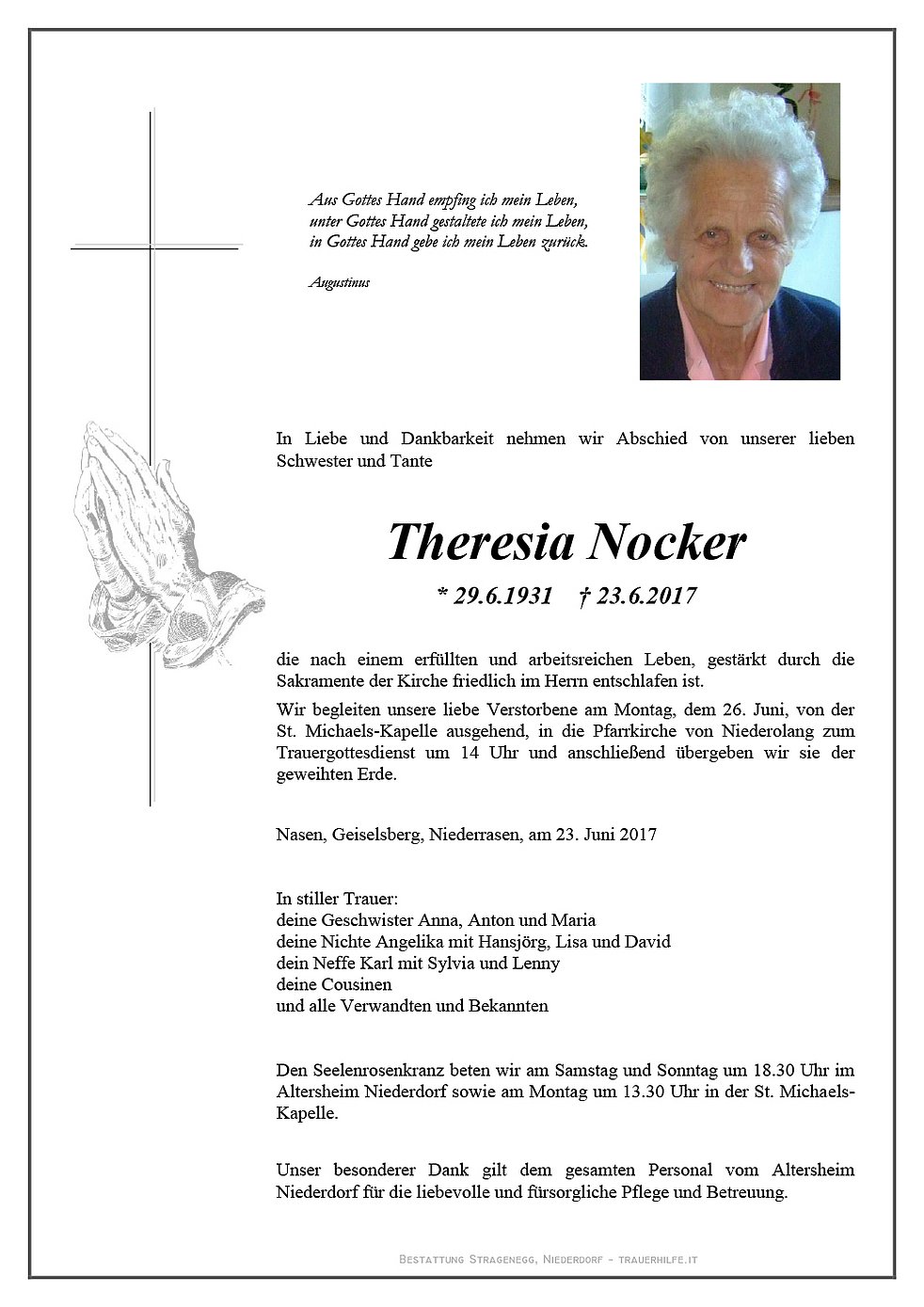 Wir begleiten unsere liebe Verstorbene am Montag, dem 26. Juni, von der St. Michaels-Kapelle ausgehend, in die Pfarrkirche von Niederolang zum Trauergottesdienst um 14 Uhr und anschließend übergeben wir sie der geweihten Erde.