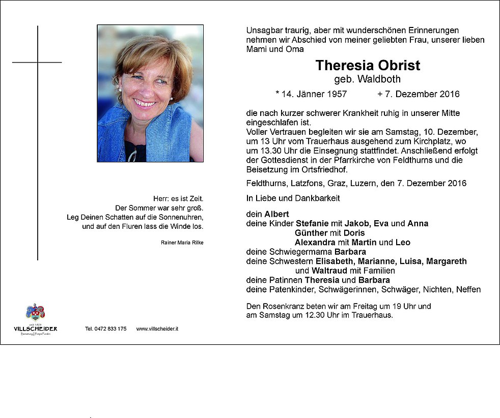 um 13.30 Uhr die Einsegnung stattfindet. Anschließend erfolgt der Gottesdienst in der Pfarrkirche von Feldthurns und die Beisetzung im Ortsfriedhof.