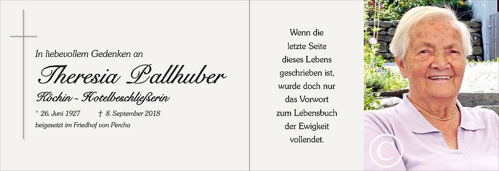 die im Alter von 91 Jahren ihr Leben, das von Arbeit und treuer Pflichterfüllung, aber auch von Freude und schönen Erfahrungen geprägt war, im Frieden mit sich und der Welt in die Hände Gottes zurückgegeben hat.