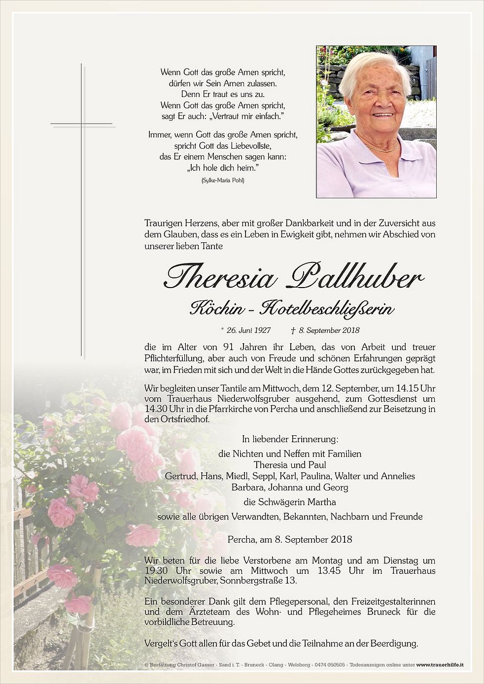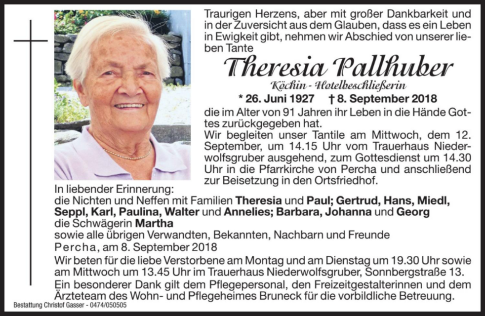 Wir begleiten unser Tantile am Mittwoch, dem 12. September, um 14.15 Uhr vom Trauerhaus Niederwolfsgruber ausgehend, zum Gottesdienst um 14.30 Uhr in die Pfarrkirche von Percha und anschließend zur Beisetzung in den Ortsfriedhof.