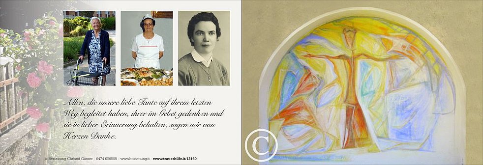 Traurigen Herzens, aber mit großer Dankbarkeit und in der Zuversicht aus dem Glauben, dass es ein Leben in Ewigkeit gibt, nehmen wir Abschied von unserer lieben Tante