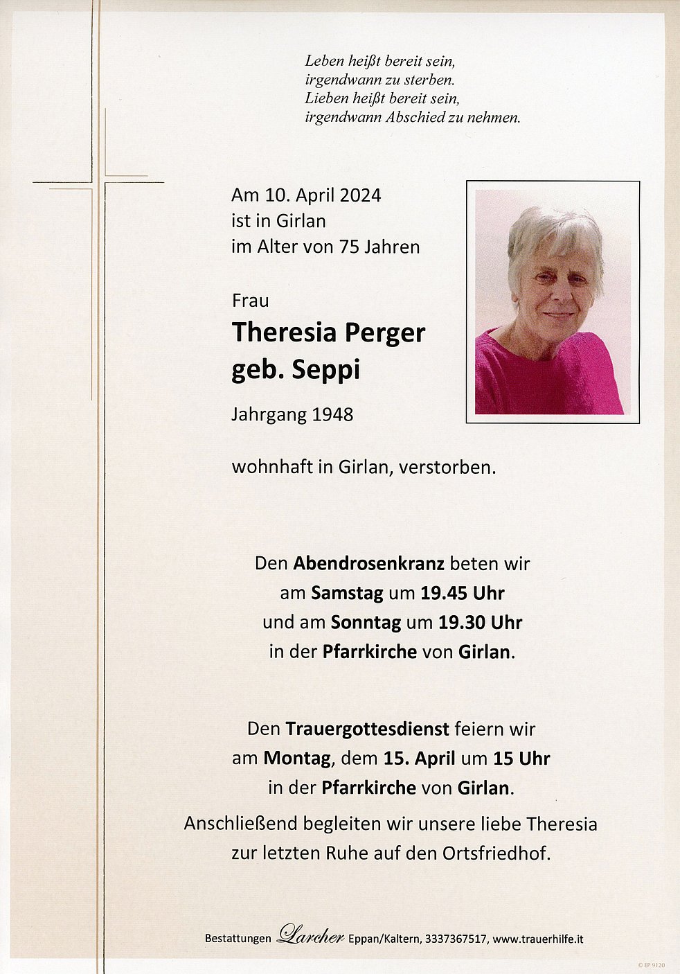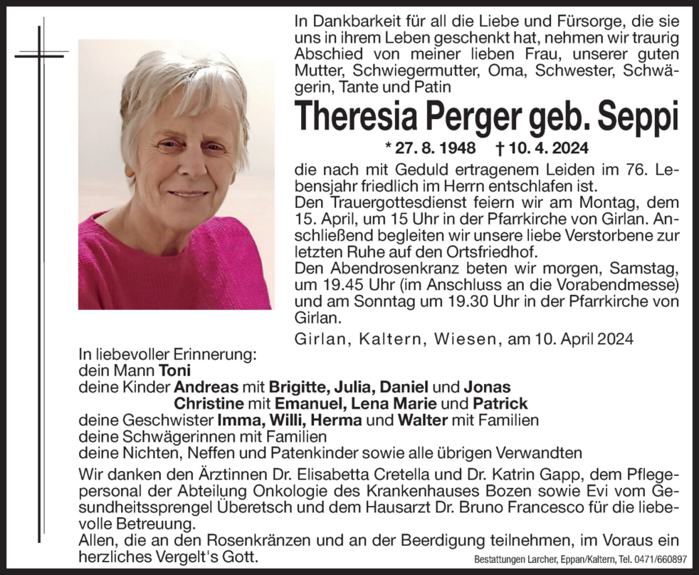 Den Trauergottesdienst feiern wir am Montag, dem 15. April um 15 Uhr in der Pfarrkirche von Girlan. Anschließend begleiten wir unsere liebe Verstorbene zur letzten Ruhe auf den Ortsfriedhof.