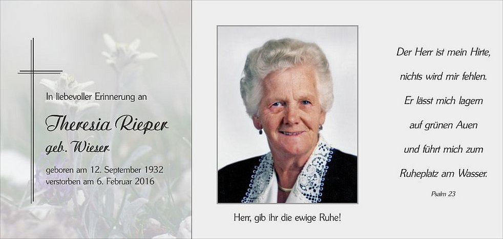 die im 84. Lebensjahr, nach längerer mit Geduld ertragener Krankheit und gestärkt mit den Sakramenten der Kirche, im Kreise ihrer Familie eingeschlafen ist.