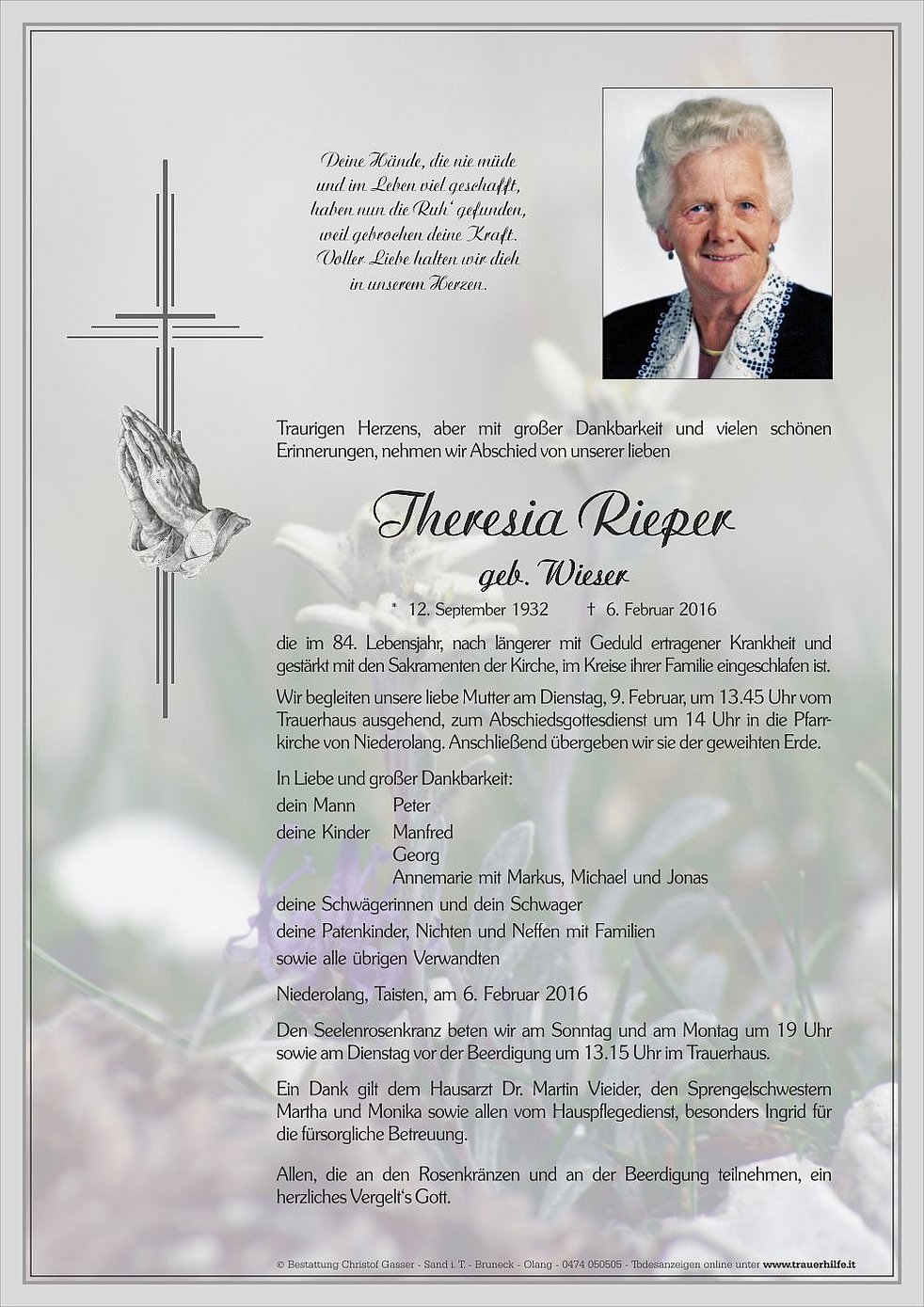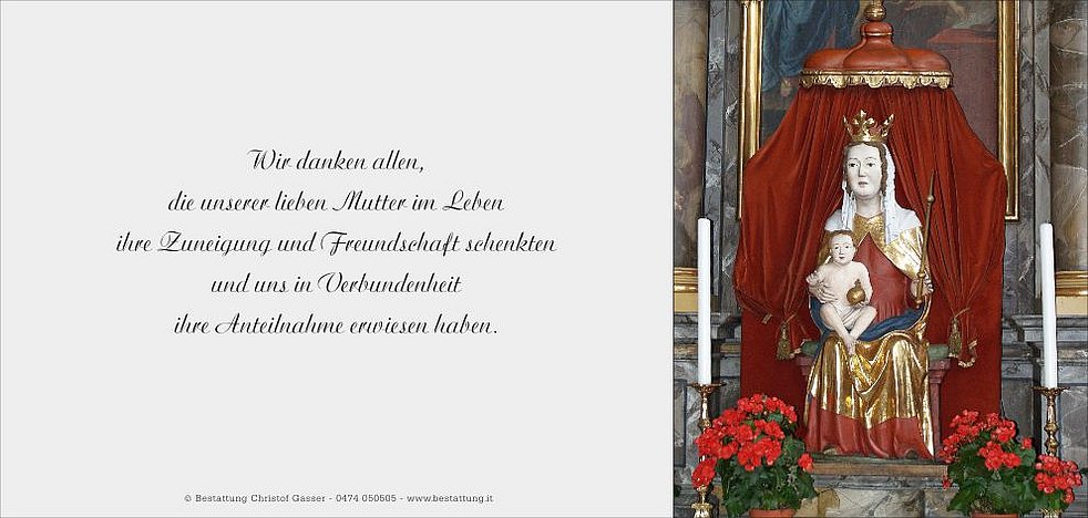 Ein Dank gilt dem Hausarzt Dr. Martin Vieider, den Sprengelschwestern Martha und Monika sowie allen vom Hauspflegedienst, besonders Ingrid für die fürsorgliche Betreuung.