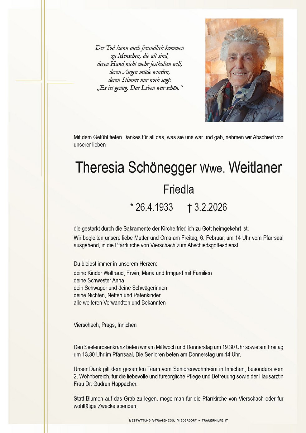 Begräbnisgottesdienst: 06.02. - 14:00 Uhr Vierschach