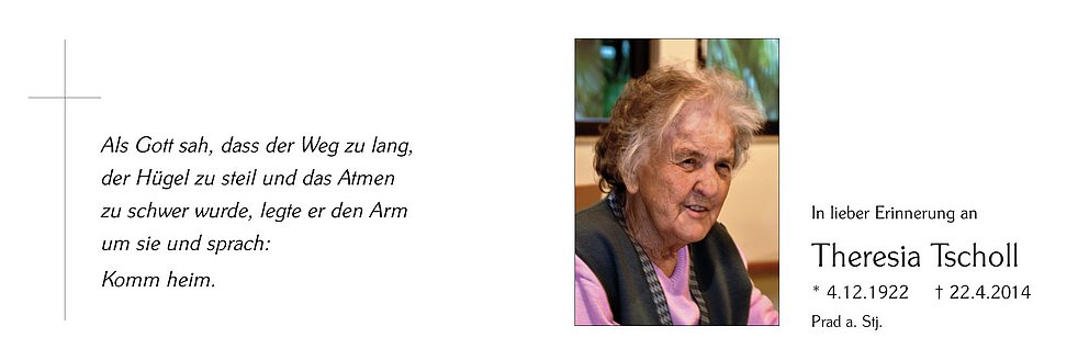 Am Freitag, 25. April, um 13.30 Uhr beten wir den Rosenkranz in der Pfarrkirche; um 14 Uhr feiern wir den Begräbnisgottesdienst, und anschließend begleiten wir unsere liebe Oma zur letzten Ruhe auf den Ortsfriedhof von Prad a. Stj.