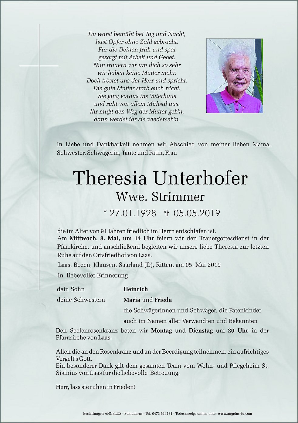 Am Mittwoch, 8. Mai, um 14 Uhr feiern wir den Trauergottesdienst in der Pfarrkirche, und anschließend begleiten wir unsere liebe Theresia zur letzten Ruhe auf den Ortsfriedhof von Laas.
