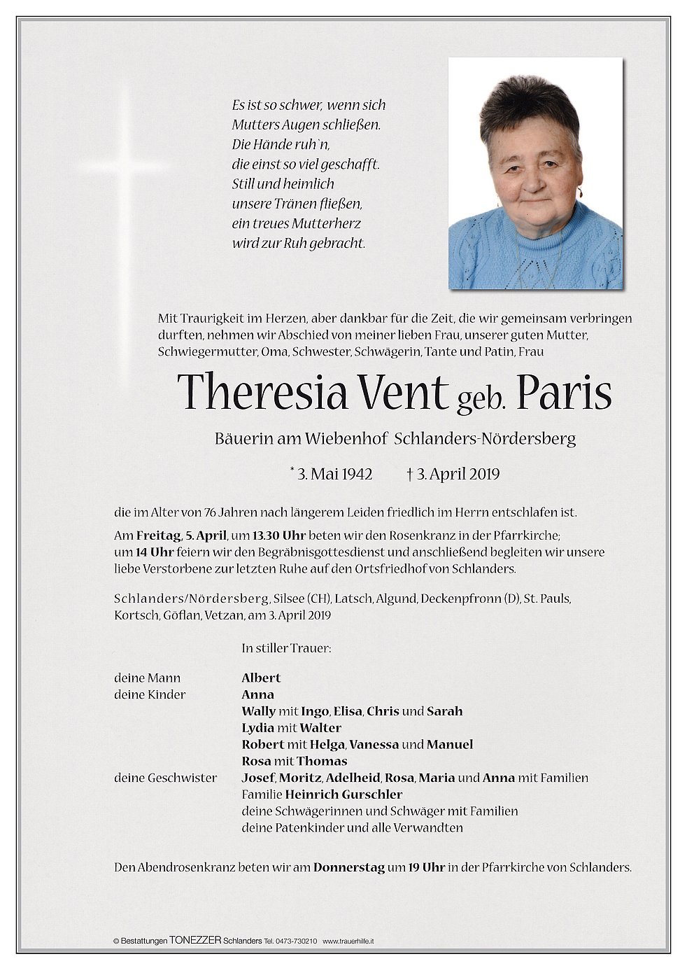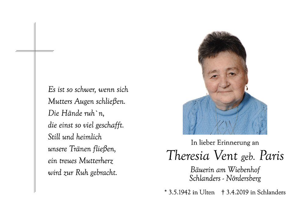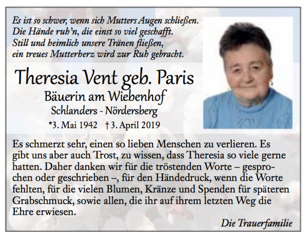 Am Freitag, 5. April, um 13.30 Uhr beten wir den Rosenkranz in der Pfarrkirche; um 14 Uhr feiern wir den Begräbnisgottesdienst und anschließend begleiten wir unsere liebe Verstorbene zur letzten Ruhe auf den Ortsfriedhof von Schlanders.