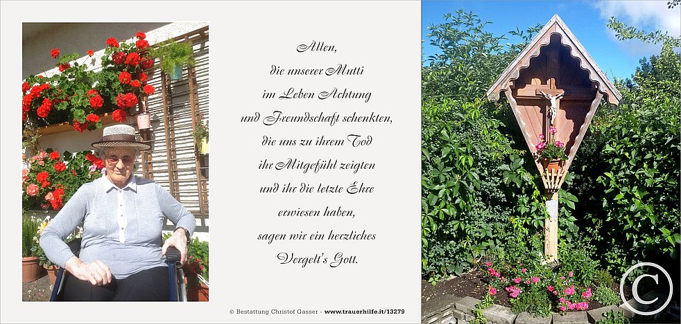 Ein besonderer Dank gilt den Ärzten Dr. Andreas Felder und Dr. Johann Hainz sowie dem gesamten Team vom 6. und 2. Wohnbereich des Wohn- und Pflegeheimes Bruneck für die liebevolle und fürsorgliche Betreuung.