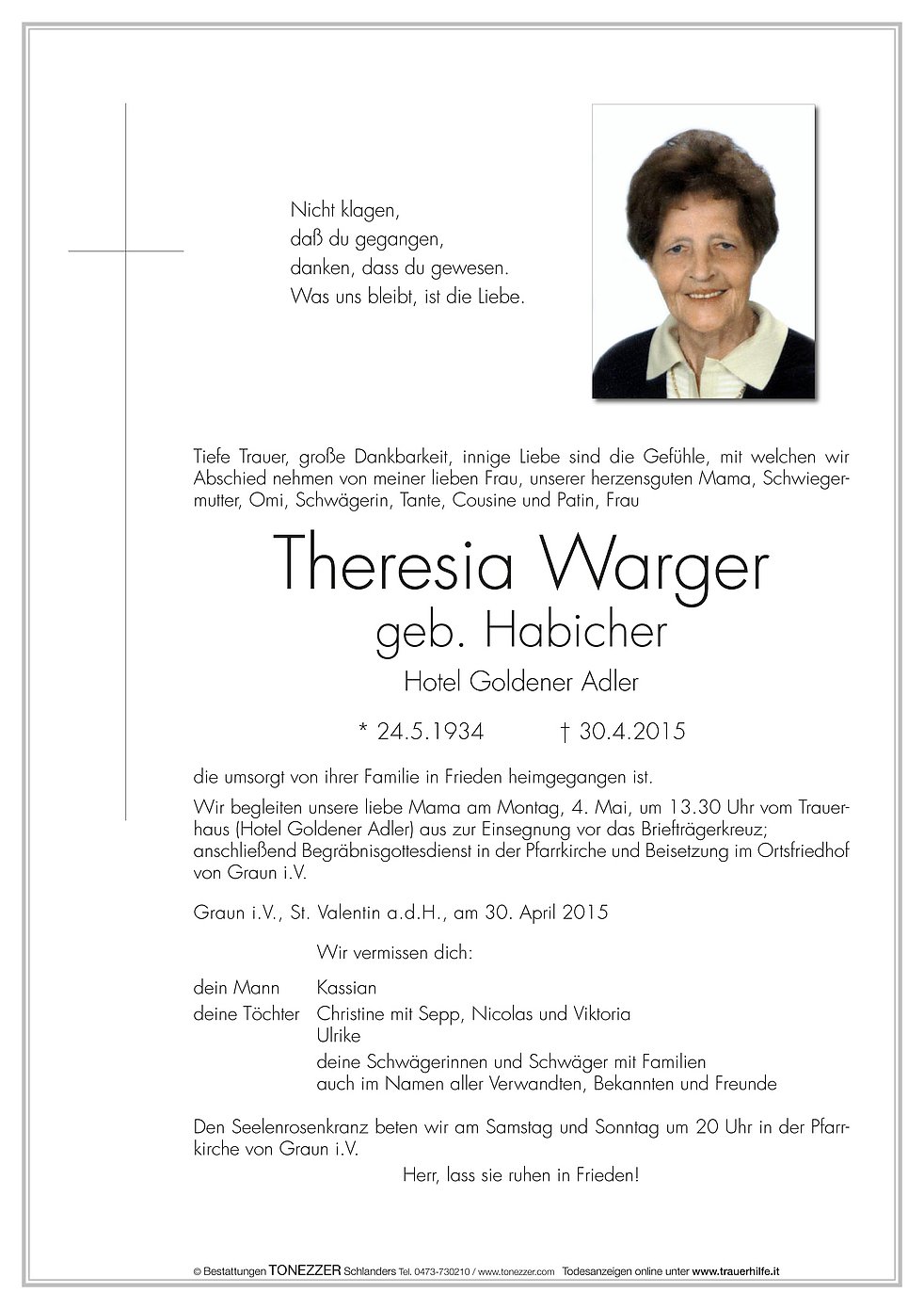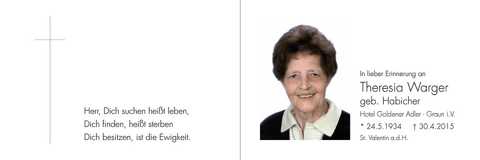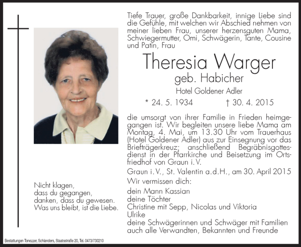 Wir begleiten unsere liebe Mama am Montag, 4. Mai, um 13.30 Uhr vom Trauerhaus (Hotel Goldener Adler) aus zur Einsegnung vor das Briefträgerkreuz;
