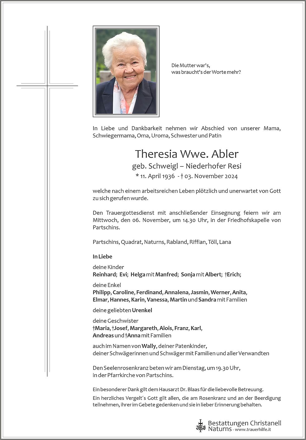 Den Trauergottesdienst mit anschließender Einsegnung feiern wir am Mittwoch, den 06. November, um 14.30 Uhr, in der Friedhofskapelle von Partschins.