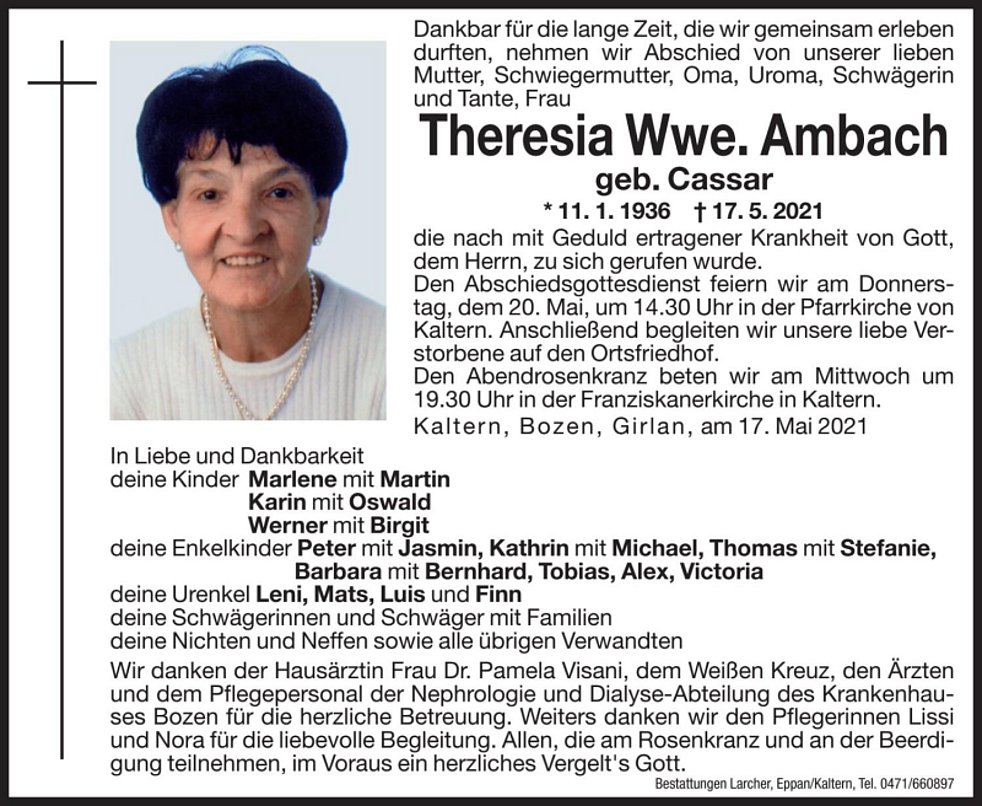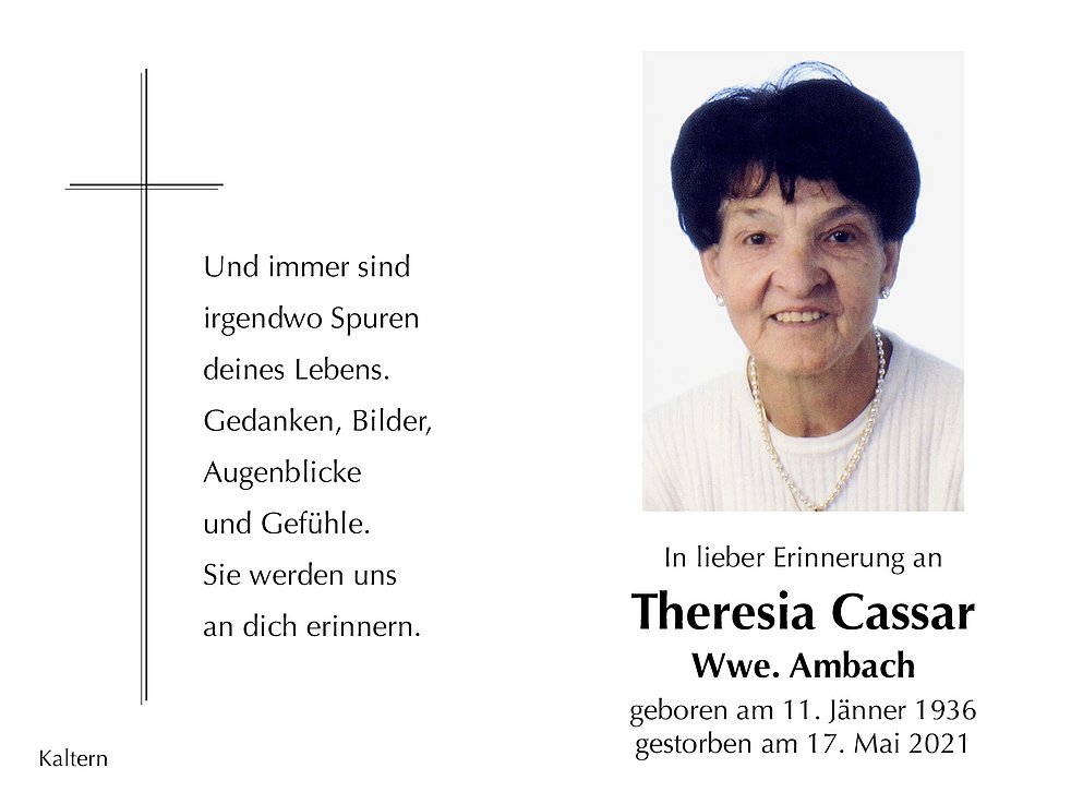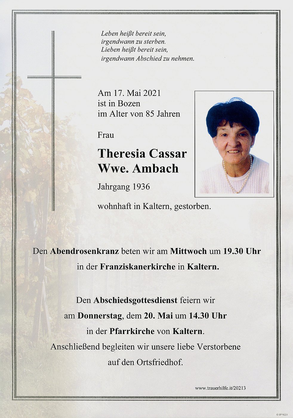 Den Abschiedsgottesdienst feiern wir am Donnerstag, dem 20. Mai um 14.30 Uhr in der Pfarrkirche von Kaltern. Anschließend begleiten wir unsere liebe Verstorbene auf den Ortsfriedhof.