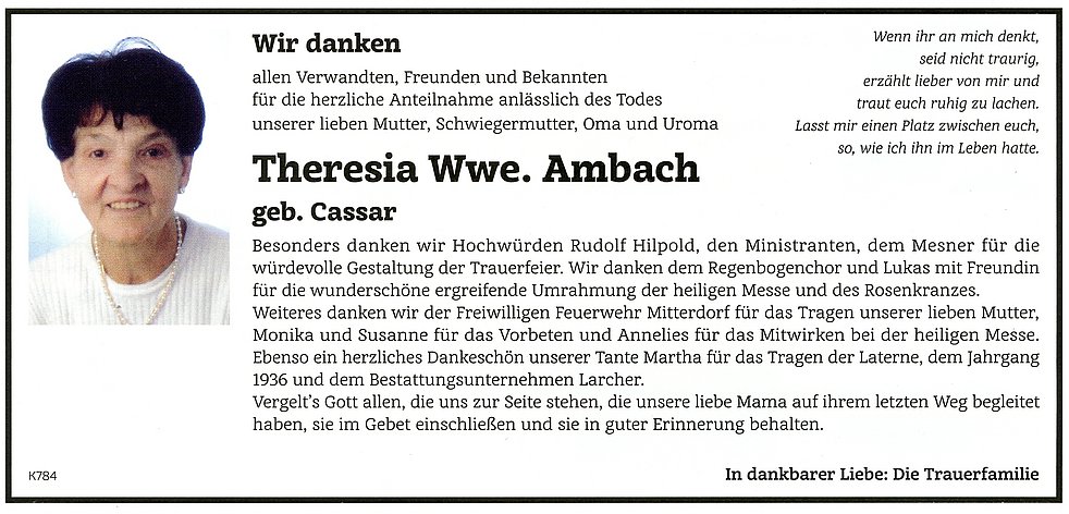 Allen, die am Rosenkranz und an der Beerdigung teilnehmen, im Voraus ein herzliches Vergelt`s Gott.