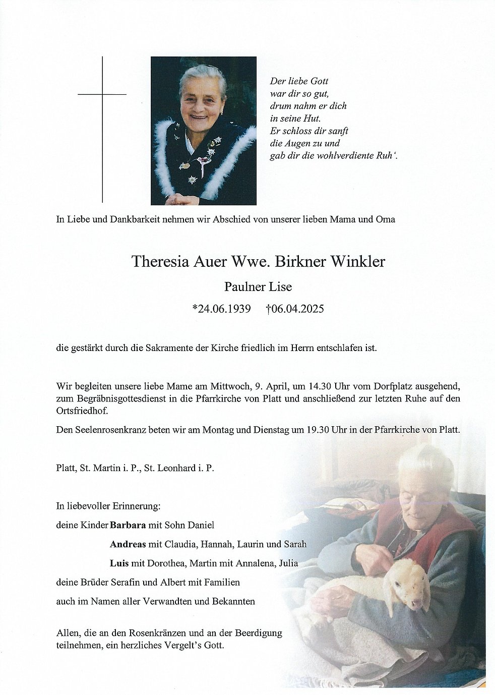 Wir begleiten unsere liebe Mame am Mittwoch, 9. April, um 14.30 Uhr vom Dorfplatz ausgehend, zum Begräbnisgottesdienst in die Pfarrkirche von Platt und anschließend zur letzten Ruhe auf den Ortsfriedhof.