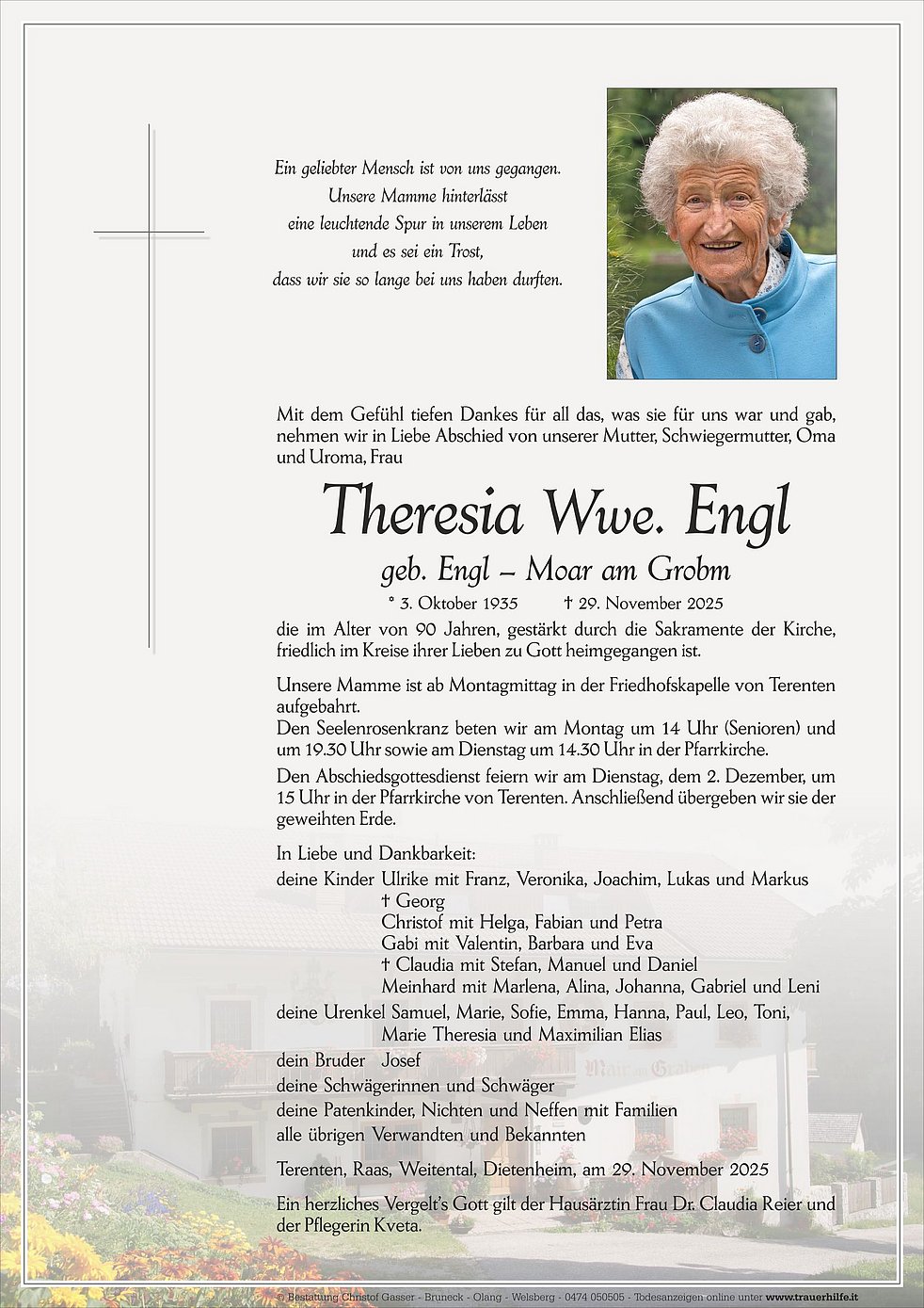 Unsere Mamme ist ab Montagmittag in der Friedhofskapelle von Terenten aufgebahrt.