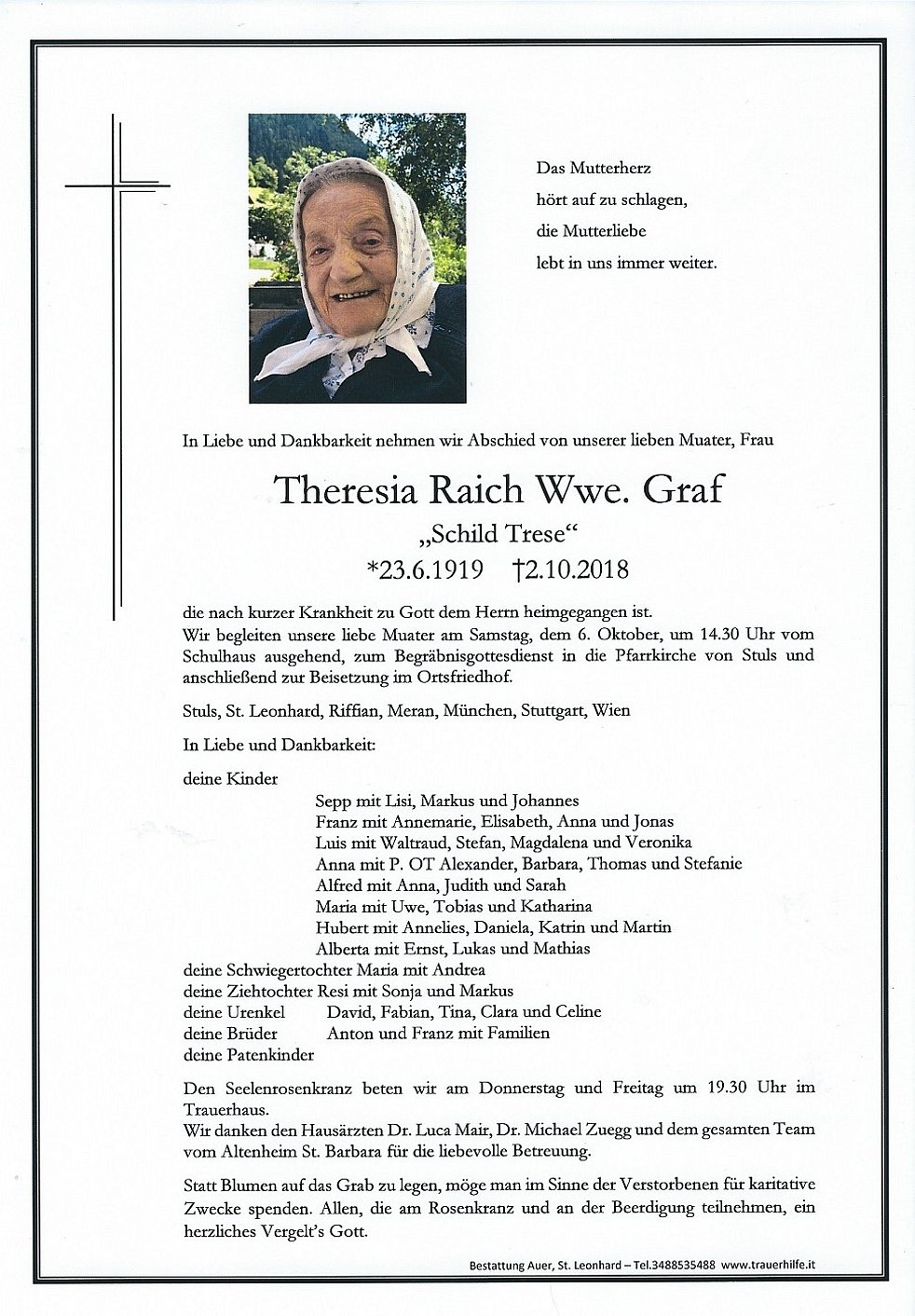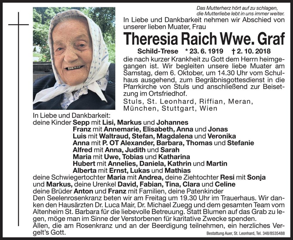 Wir begleiten unsere liebe Muater am Samstag, dem 6. Oktober, um 14.30 Uhr vom Schulhaus ausgehend, zum Begräbnisgottesdienst in die Pfarrkirche von Stuls und anschließend zur Beisetzung im Ortsfriedhof.