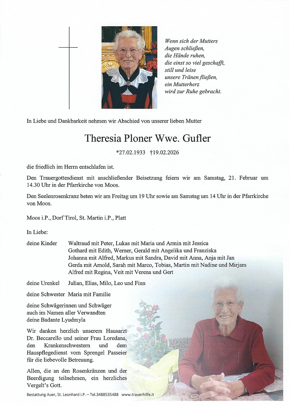 Wir danken herzlich unserem Hausarzt Dr. Beccarello und seiner Frau Loredana, den Krankenschwestern und dem Hauspflegedienst vom Sprengel Passeier für die liebevolle Betreuung.
