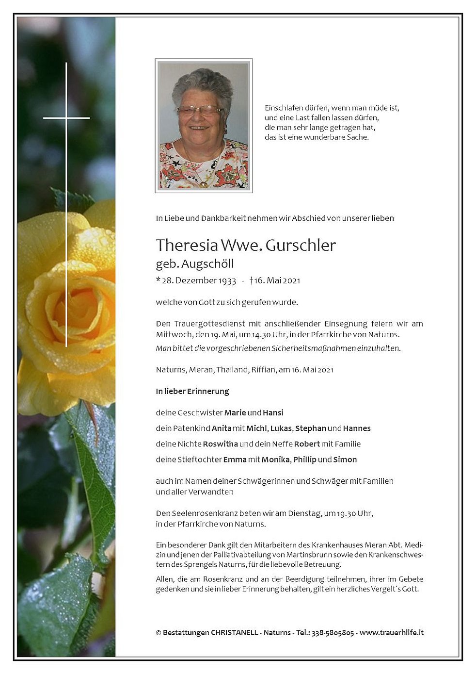 Den Trauergottesdienst mit anschließender Einsegnung feiern wir am Mittwoch, den 19. Mai, um 14.30 Uhr, in der Pfarrkirche von Naturns.