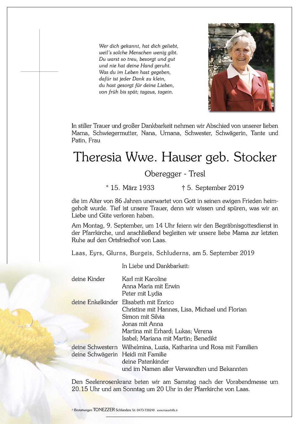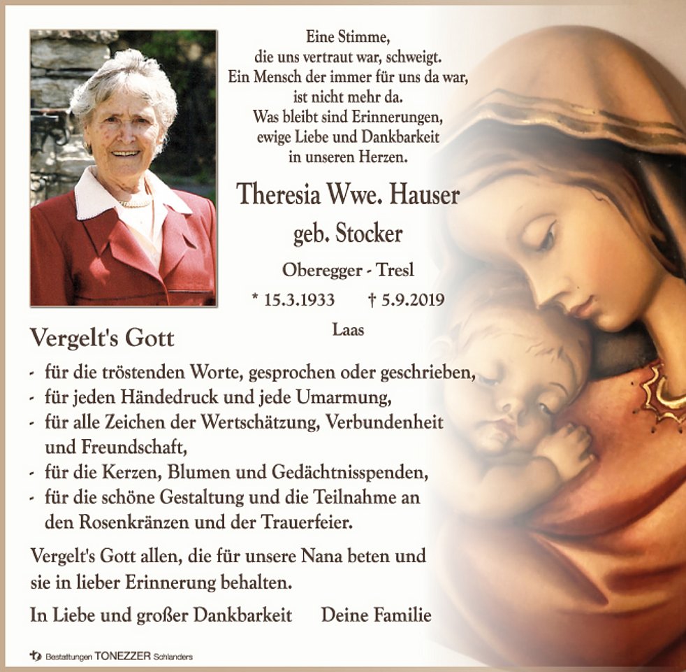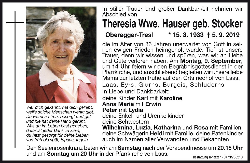 Am Montag, 9. September, um 14 Uhr feiern wir den Begräbnisgottesdienst in der Pfarrkirche, und anschließend begleiten wir unsere liebe Mama zur letzten Ruhe auf den Ortsfriedhof von Laas.