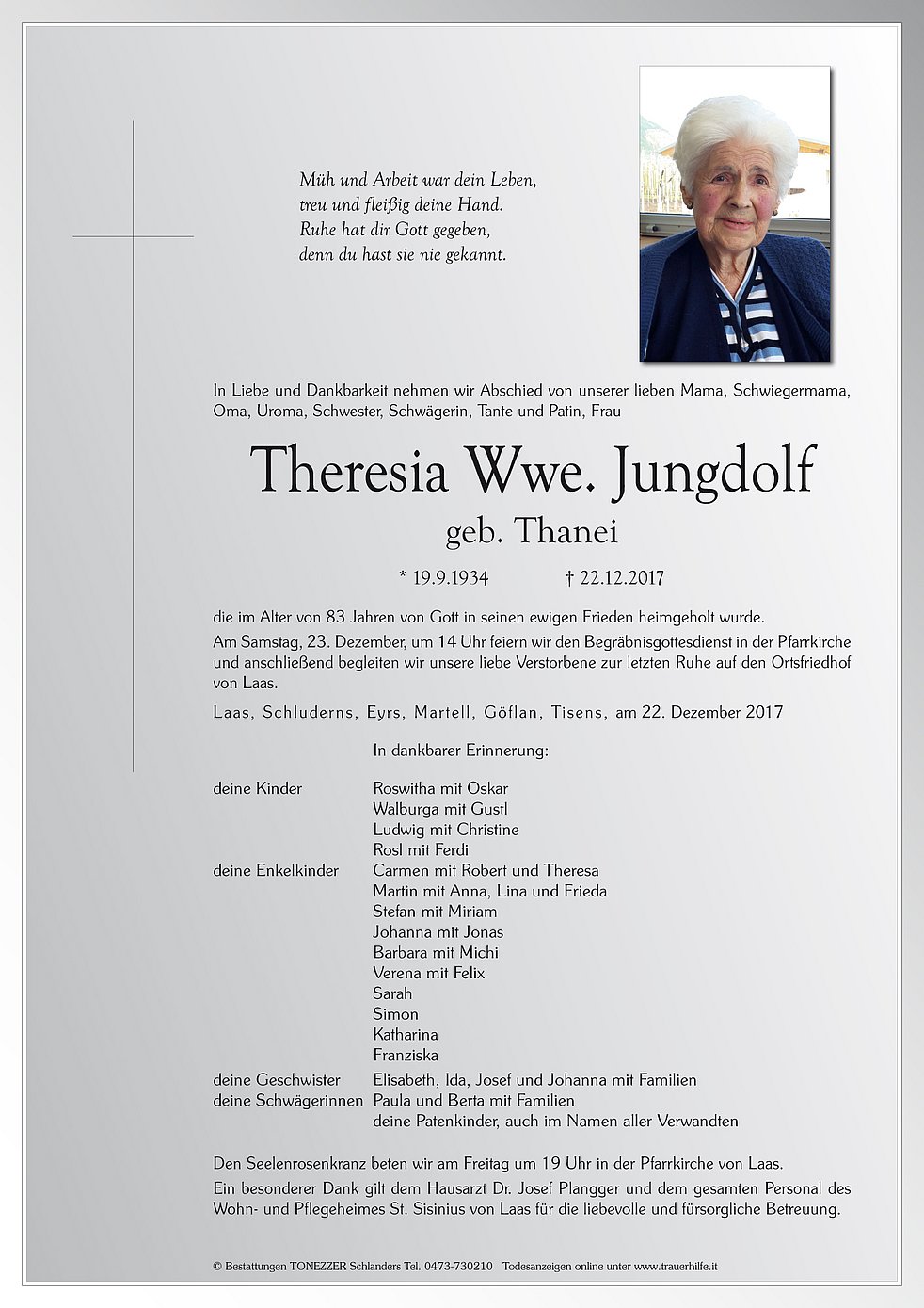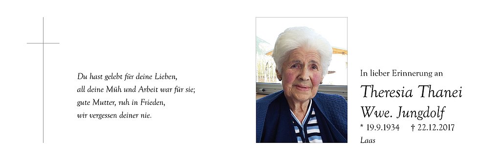 Ein besonderer Dank gilt dem Hausarzt Dr. Josef Plangger und dem gesamten Personal des Wohn- und Pflegeheimes St. Sisinius von Laas für die liebevolle und fürsorgliche Betreuung.