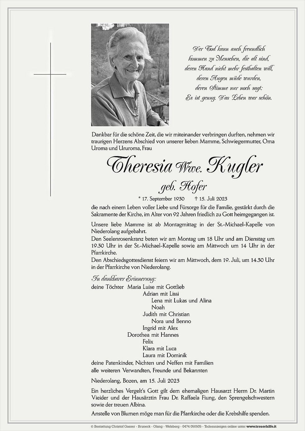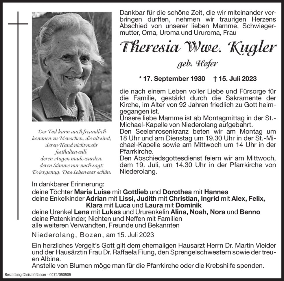 Anstelle von Blumen möge man für die Pfarrkirche oder die Krebshilfe spenden.