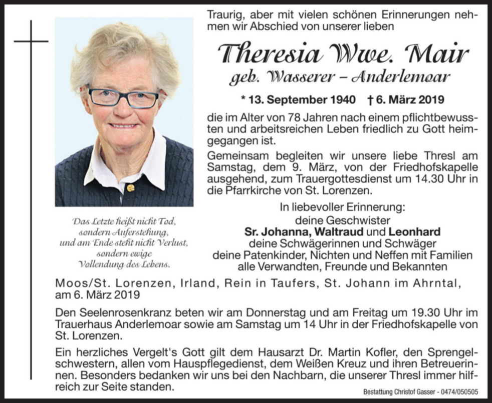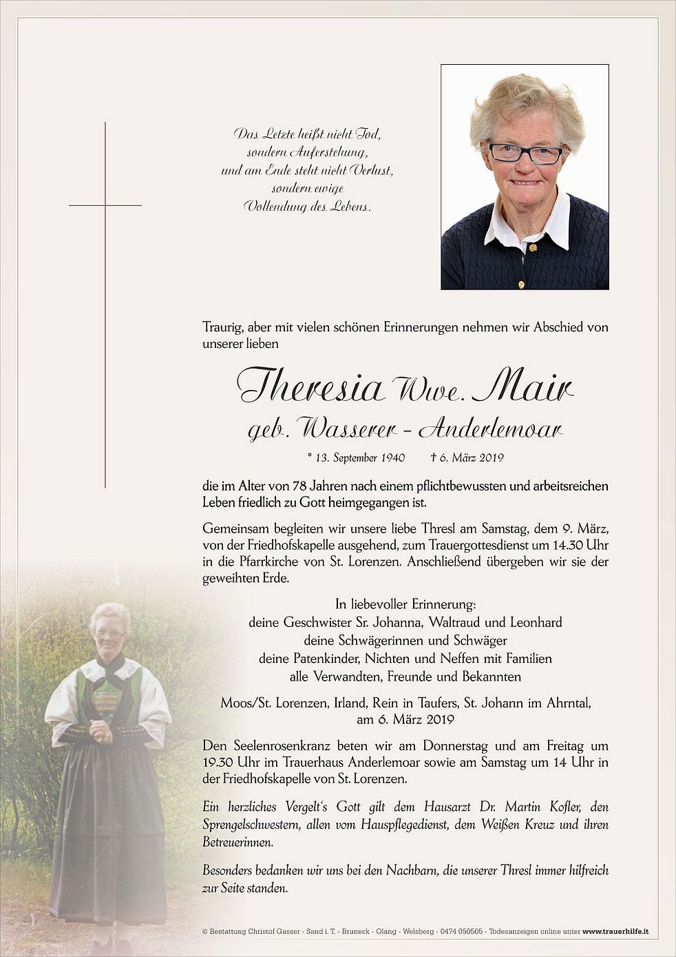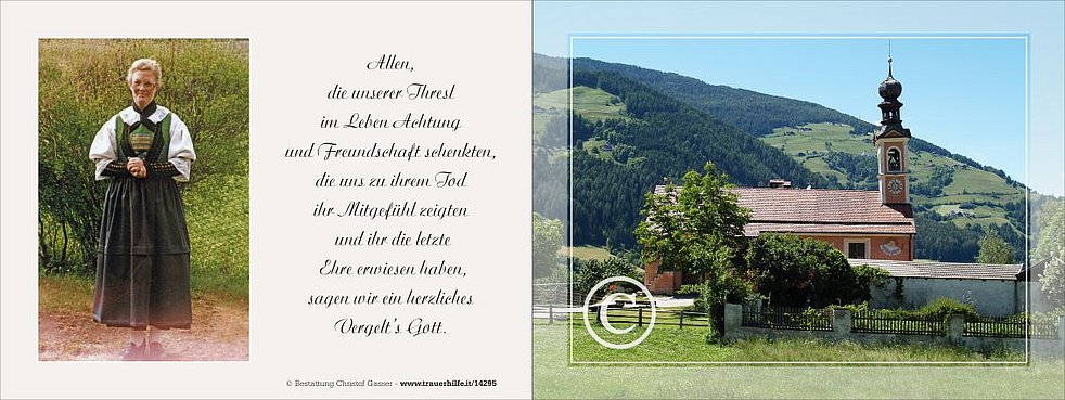 Gemeinsam begleiten wir unsere liebe Thresl am Samstag, dem 9. März, von der Friedhofskapelle ausgehend, zum Trauergottesdienst um 14.30 Uhr in die Pfarrkirche von St. Lorenzen. Anschließend übergeben wir sie der geweihten Erde.