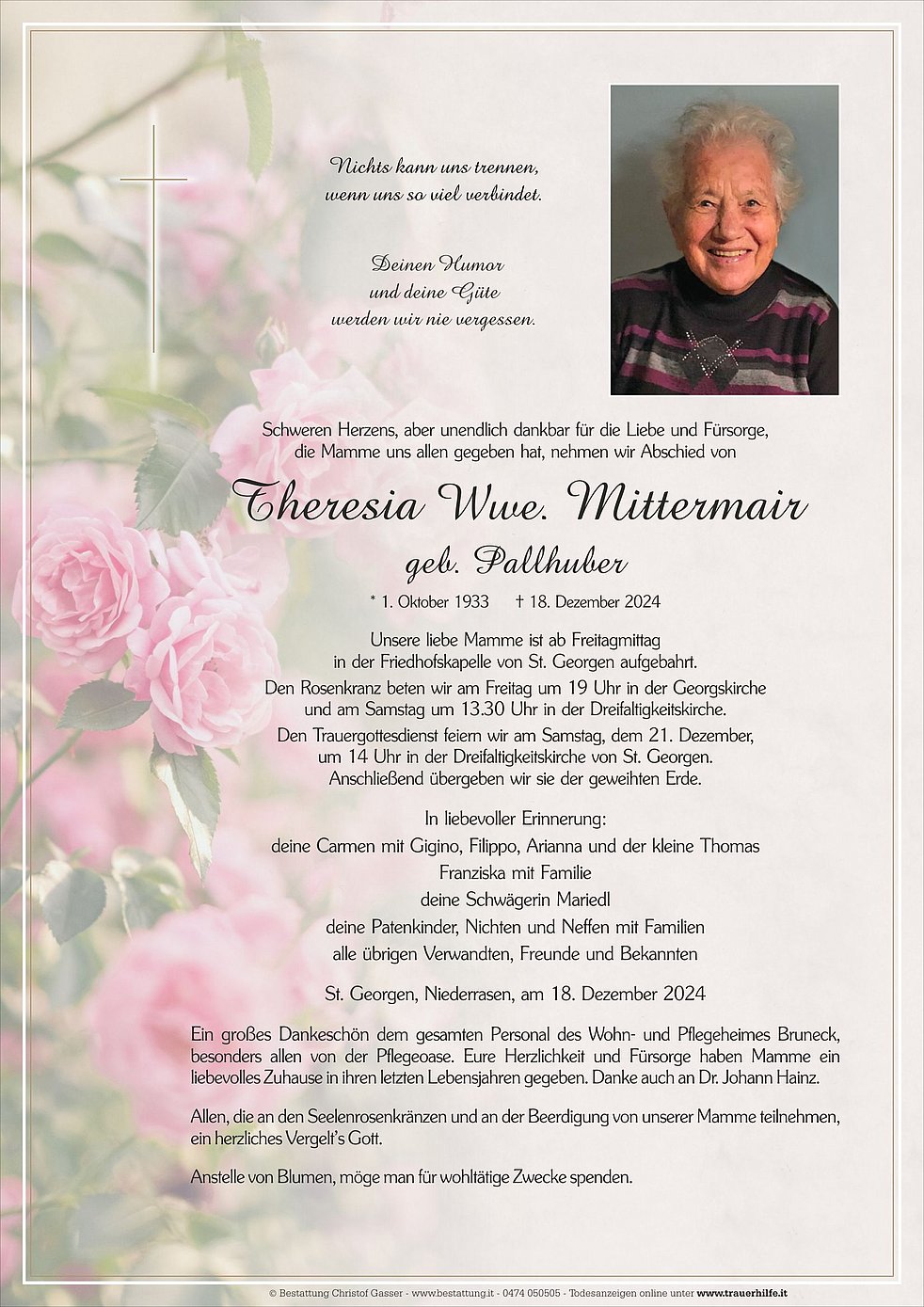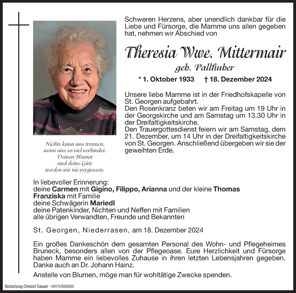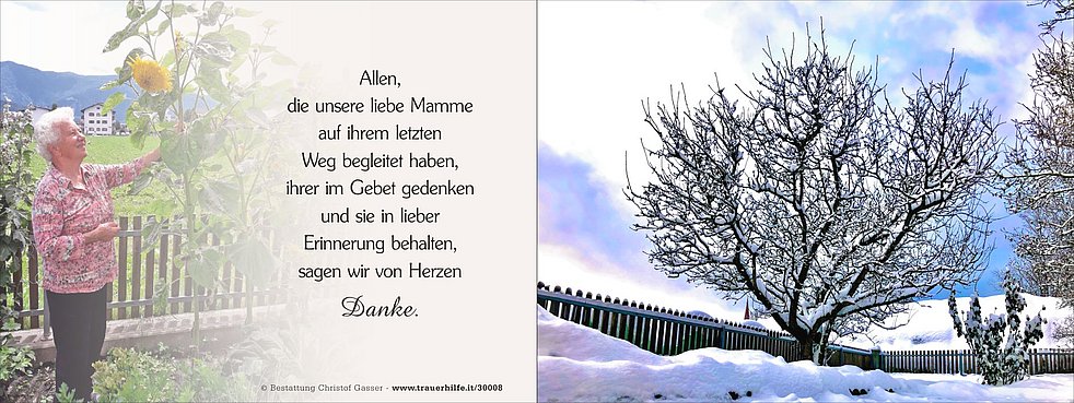Ein großes Dankeschön dem gesamten Personal des Wohn- und Pflegeheimes Bruneck, besonders allen von der Pflegeoase. Eure Herzlichkeit und Fürsorge haben Mamme ein liebevolles Zuhause in ihren letzten Lebensjahren gegeben. Danke auch an Dr. Johann Hainz.