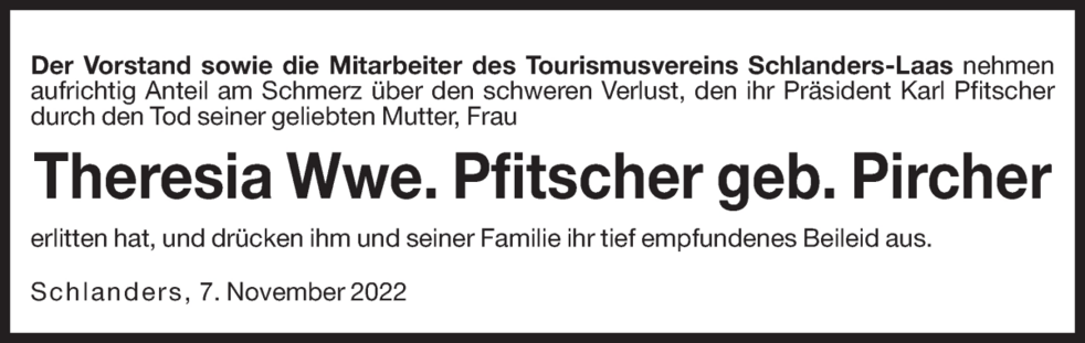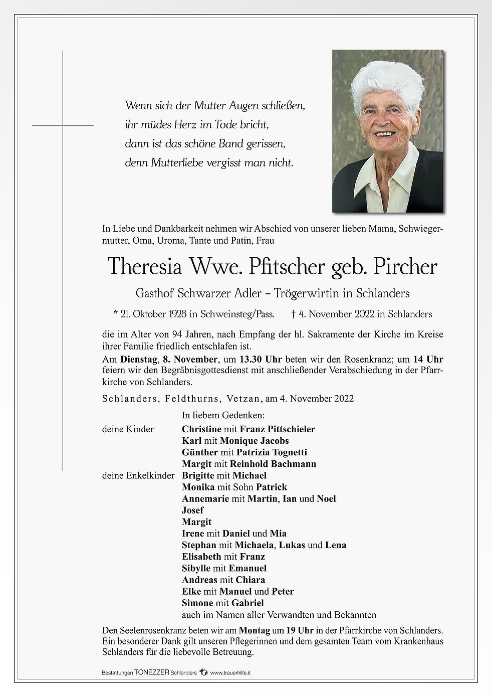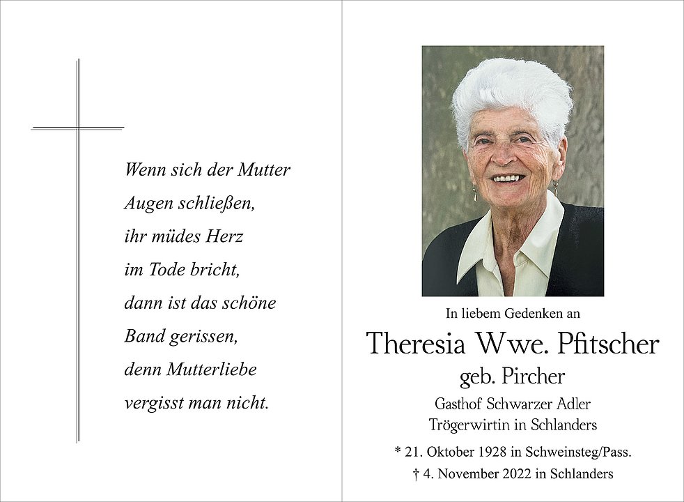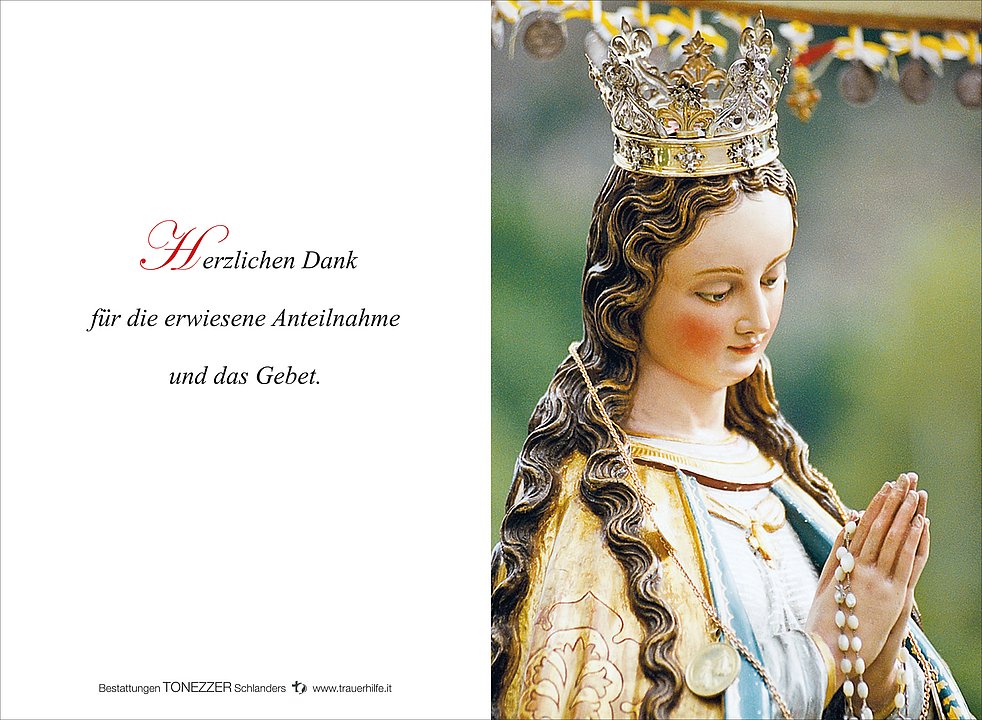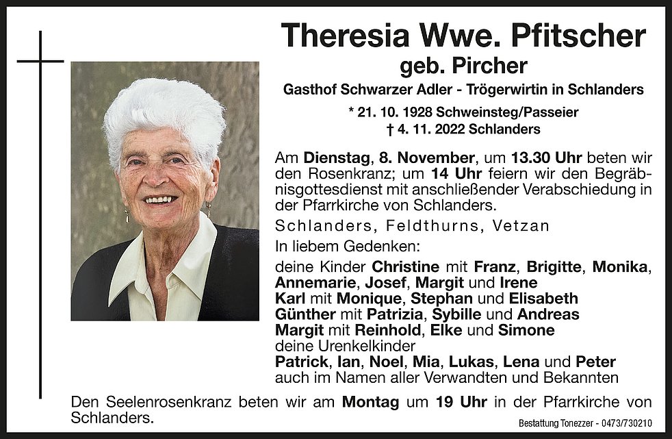 Am Dienstag, 8. November, um 13.30 Uhr beten wir den Rosenkranz; um 14 Uhr feiern wir den Begräbnisgottesdienst mit anschließender Verabschiedung in der Pfarrkirche von Schlanders.