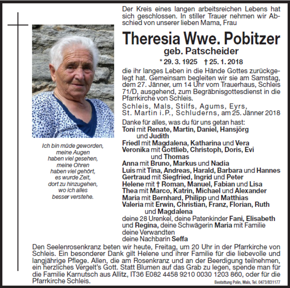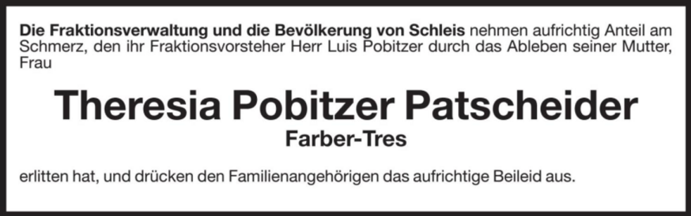 Statt Blumen auf das Grab zu legen, spende man für die Familie Karnutsch aus Allitz, IT36 E082 4458 9210 0030 1203 860, oder für die Pfarrkirche Schleis.