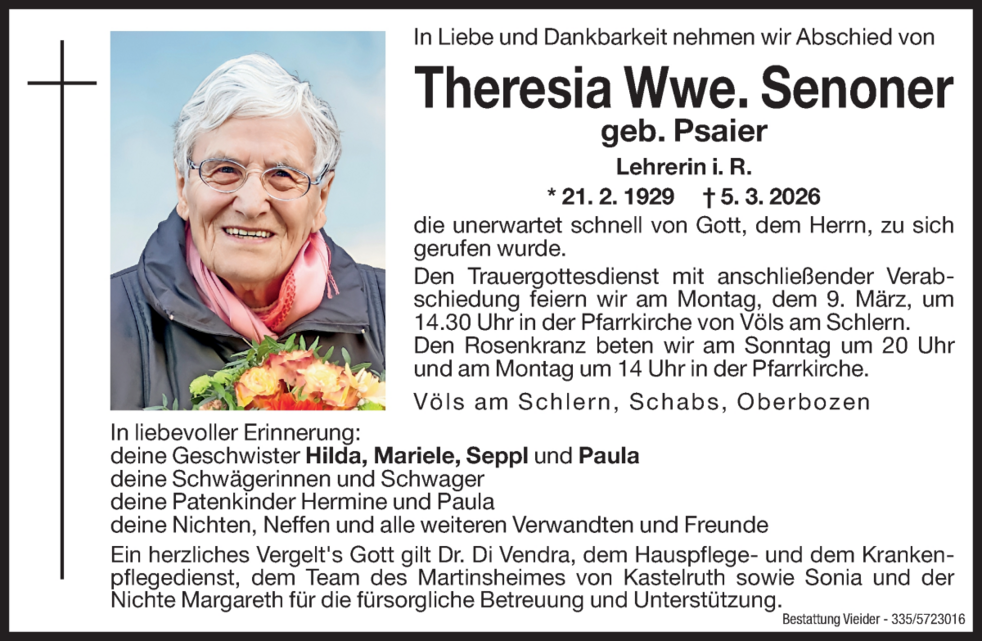 Den Trauergottesdienst mit anschließender Verabschiedung feiern wir am Montag, dem 9. März, um 14.30 Uhr in der Pfarrkirche von Völs am Schlern.