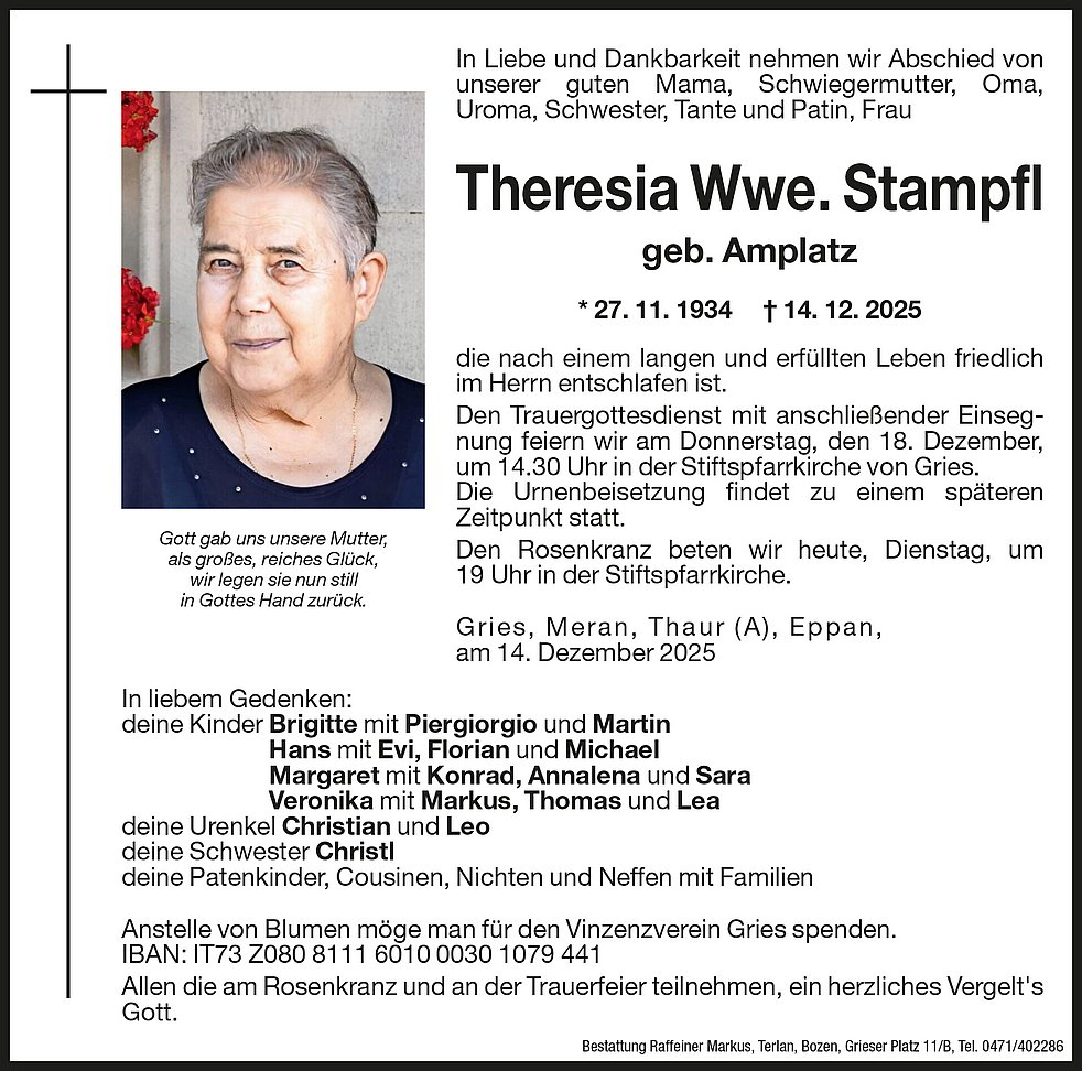 Anstelle von Blumen möge man für den Vinzenzverein Gries spenden.