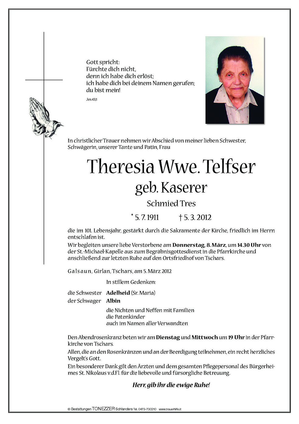 die im 101. Lebensjahr, gestärkt durch die Sakramente der Kirche, friedlich im Herrn entschlafen ist.