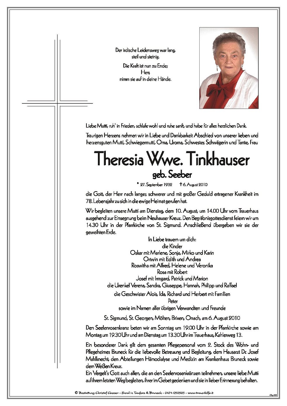 Wir begleiten unsere Mutti am Dienstag, dem 10. August, um 14.00 Uhr vom Trauerhaus ausgehend zur Einsegnung beim Neuhauser Kreuz. Den Begräbnisgottesdienst feiern wir um 14.30 Uhr in der Pfarrkirche von St. Sigmund. Anschließend übergeben wir sie der geweihten Erde.