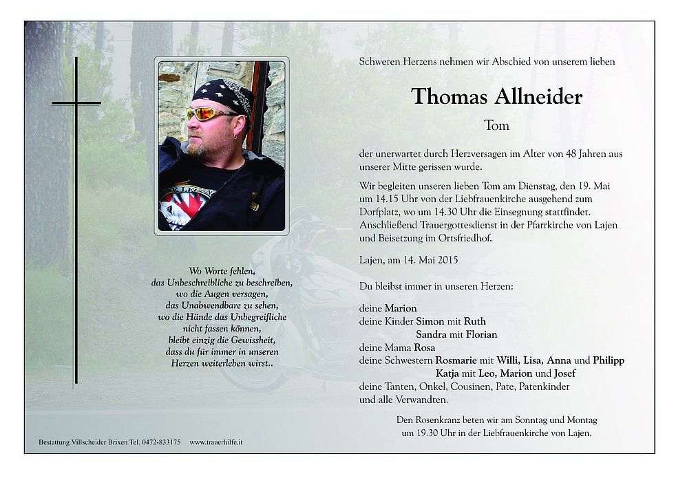 um 14.15 Uhr von der Liebfrauenkirche ausgehend zum Dorfplatz, wo um 14.30 Uhr die Einsegnung stattfindet. Anschließend Trauergottesdienst in der Pfarrkirche von Lajen und Beisetzung im Ortsfriedhof.
