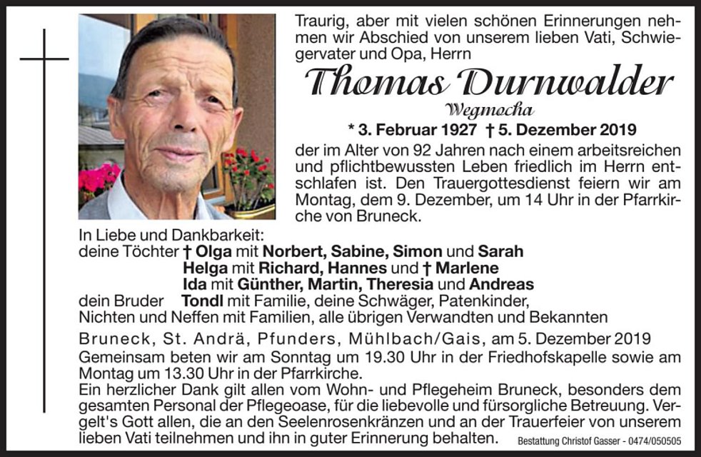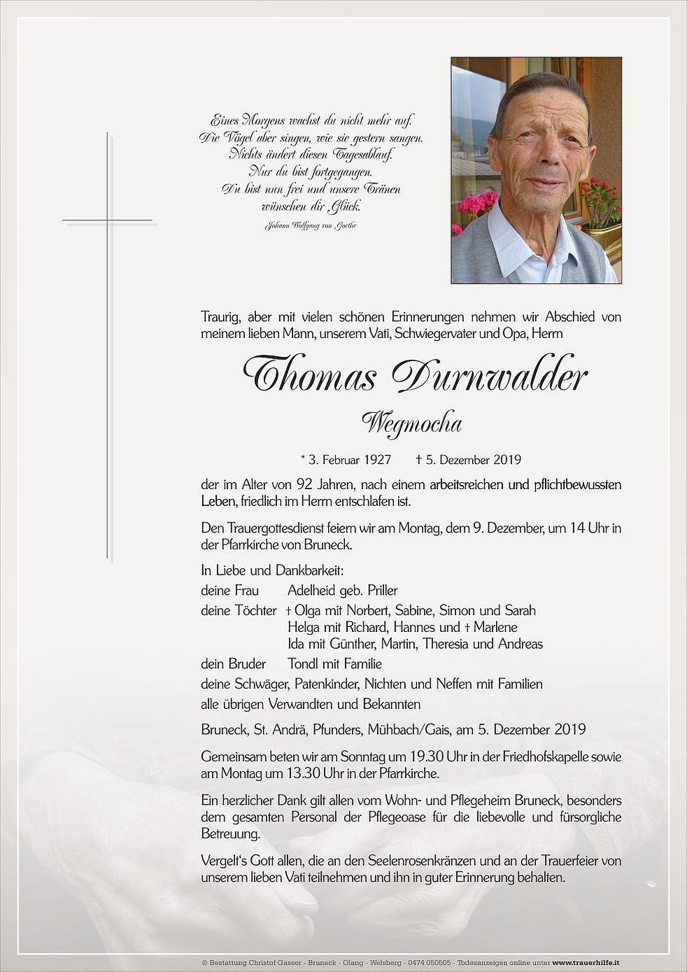 Den Trauergottesdienst feiern wir am Montag, dem 9. Dezember, um 14 Uhr in der Pfarrkirche von Bruneck.