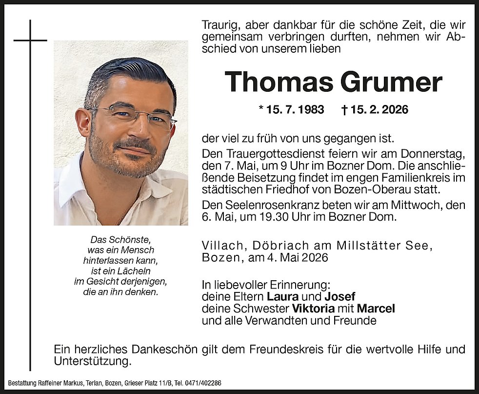 Die anschließende Beisetzung findet im engen Familienkreis im städtischen Friedhof von Bozen-Oberau statt.